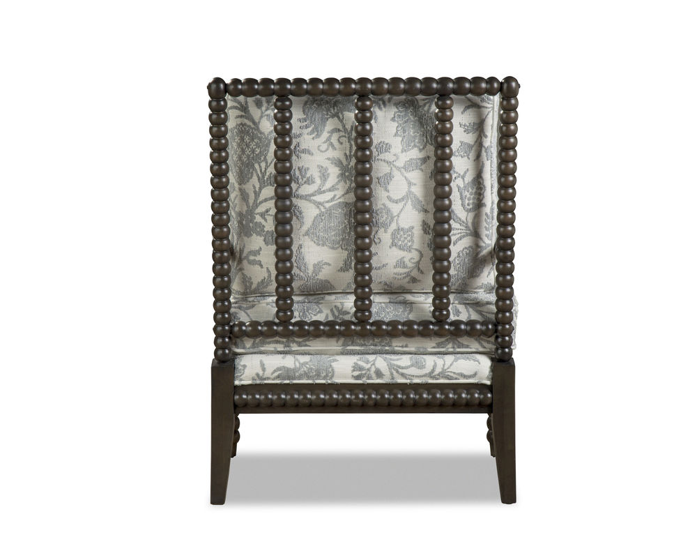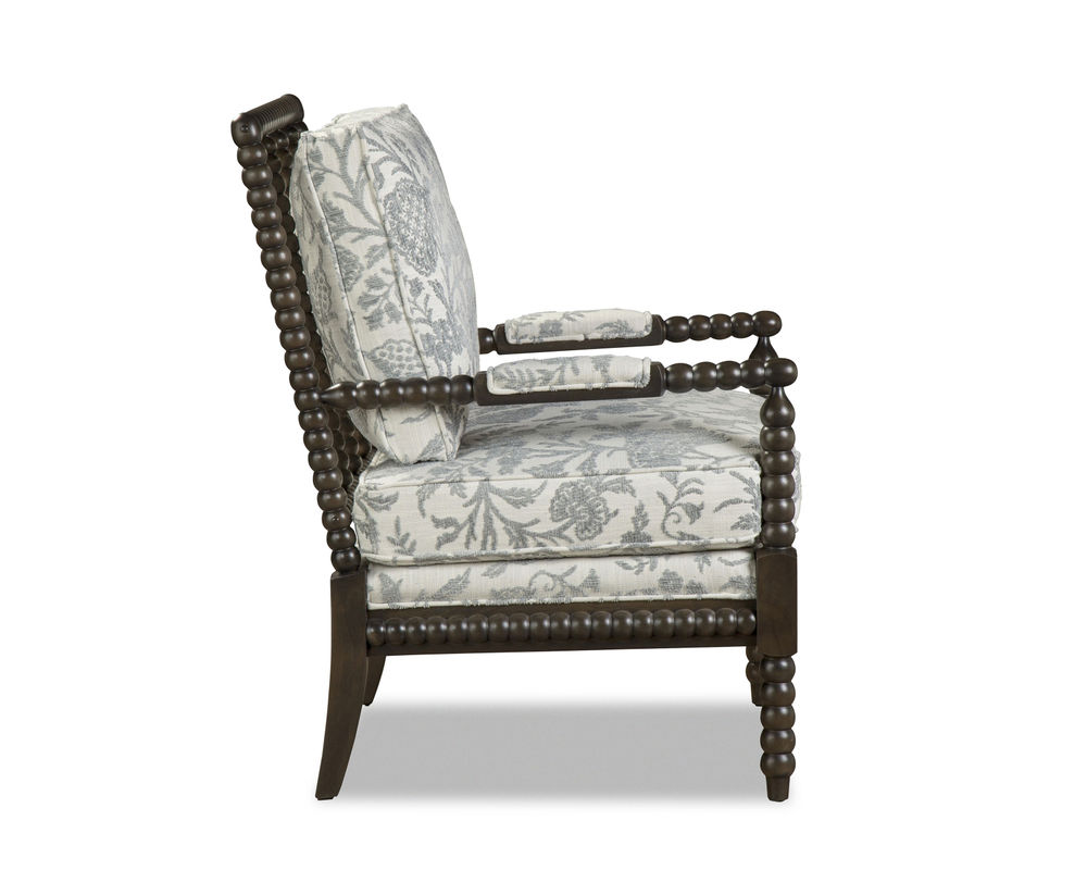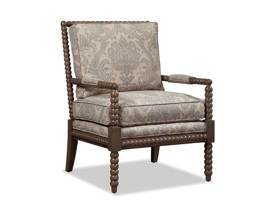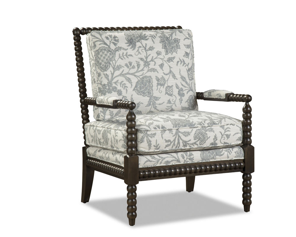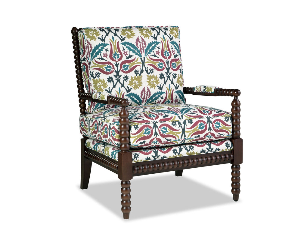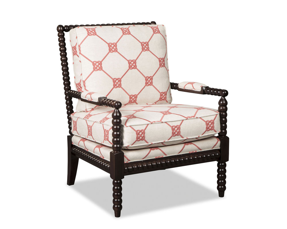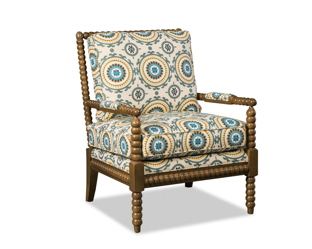 This classic carved wooden spool chair from the Paula Deen Home collection feels fresh and inviting. Featuring upholstered arm rests, contoured seat cushion, and a loose back pillow, this armchair offers comfortable livability with enduring style. Over 100 performance fabrics.