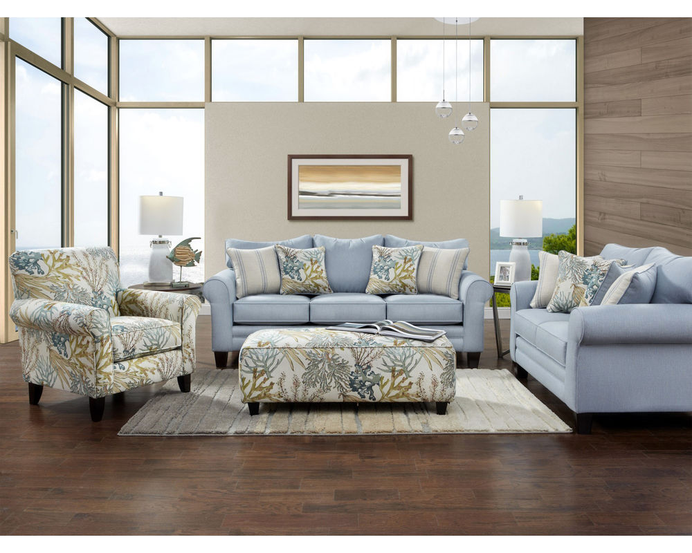 The Coral Reef Caribbean accent chair is a beautiful accent chair that features rolled arms, a tight back, a loose seat cushion with a box border welt, chunky tapered legs in a coffee finish, and a beautiful reef pattern. The Coral Reef Caribbean occasional chair is a lovely accent to our Labyrinth Sky sofa group or just as a fun, stand-alone accent chair. The Polyester blend material is soft and durable. Due to lighting and monitor differences, actual colors and finishes may vary slightly from what appears online.