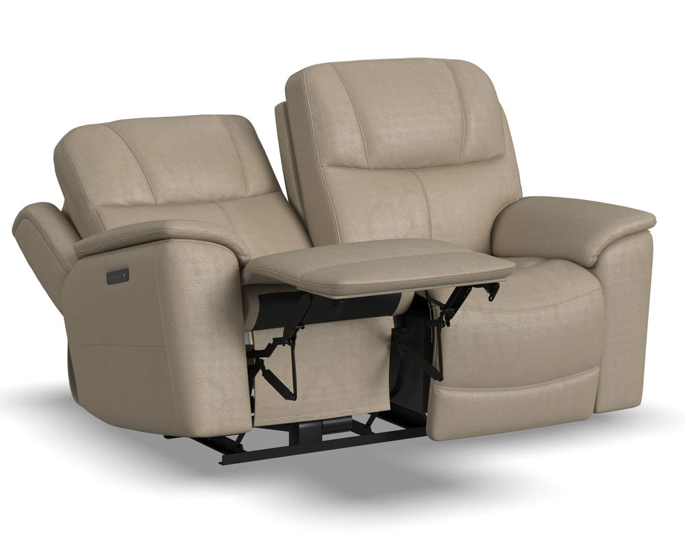 The Flexsteel Crew 1783 Power Reclining Console Loveseat provides superior ergonomics and plush comfort for your home. With its triple power functionality, you can independently adjust the headrests, and lumbar support and recline for maximum comfort. The Zero Gravity feature reduces tension and pressure on your body, while the pad-over armrests, waterfall chaise footrests, thin layered headrests, and divided back cushions provide reliable comfort all day. This loveseat also has convenient USB ports for charging mobile devices and a center storage console for keeping remotes and beverages nearby. The Flexsteel Crew 1783 Power Reclining Console Loveseat is upholstered in top-grain leather for exceptional beauty and durability and is available in two color choices. Enjoy a marathon movie night with this luxuriously comfortable and ergonomic loveseat.