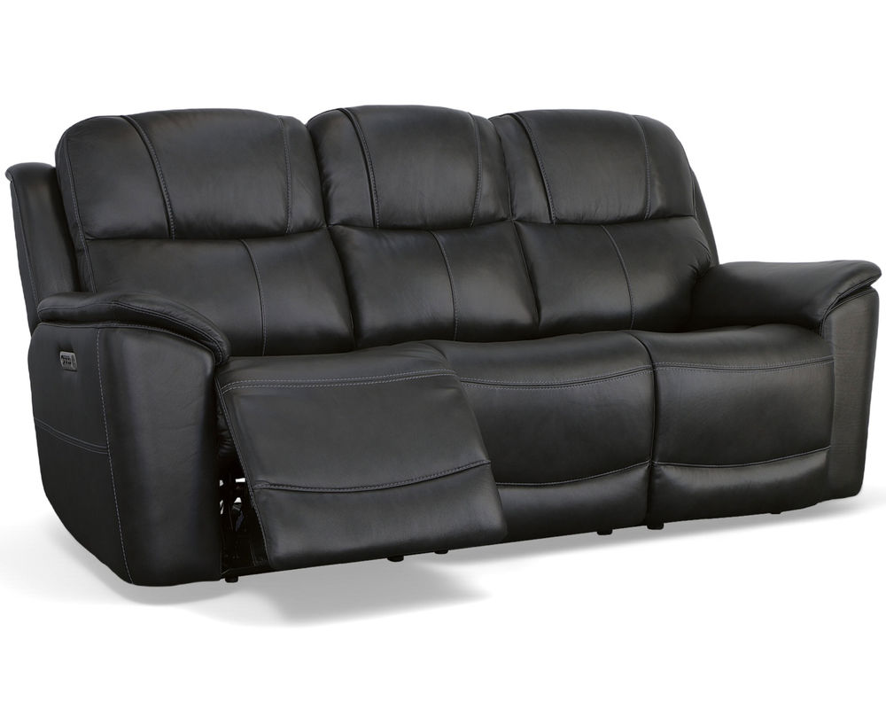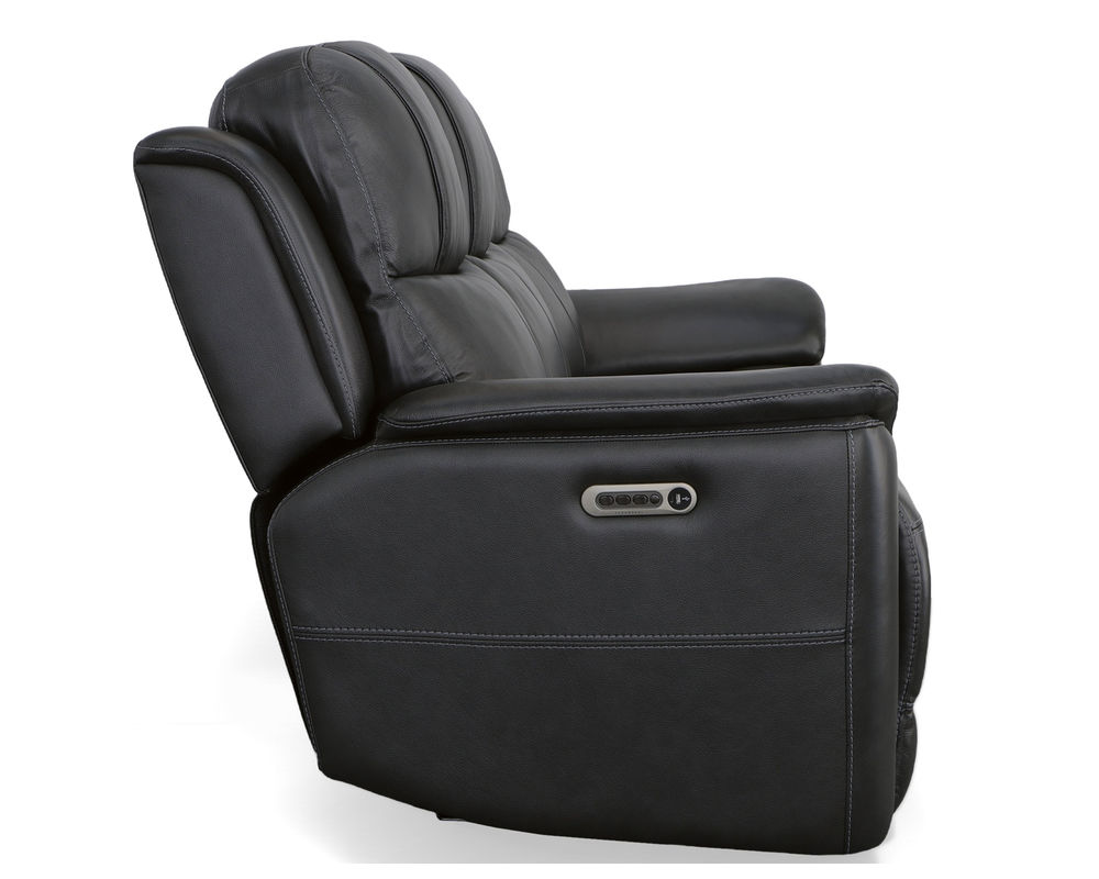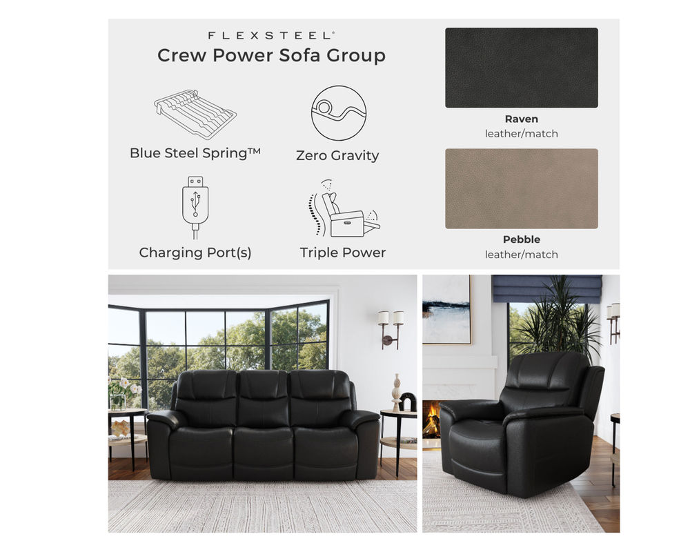 The Flexsteel Crew 1783 Power Reclining Sofa is the perfect combination of ergonomics and plush comfort. Enjoy the ultimate relaxation experience with the triple power functionality that allows you to adjust the headrest, and lumbar support and recline independently. Plus, the Zero Gravity feature reduces pressure and tension on the body making it the ideal seat for all-day comfort. The Crew power recliner also features pad-over armrests, a waterfall chaise footrest, a thin layered headrest and a divided back cushion for added luxury. With built-in USB ports to conveniently charge your mobile devices, you can easily watch your favorite shows and stay connected. Upholstered in top-grain leather for superior beauty and durability, the Crew power recliner is available in two color choices to suit any décor. Upgrade your living space with the Flexsteel Crew 1783 Power Reclining Sofa and experience the ultimate in comfort and style.