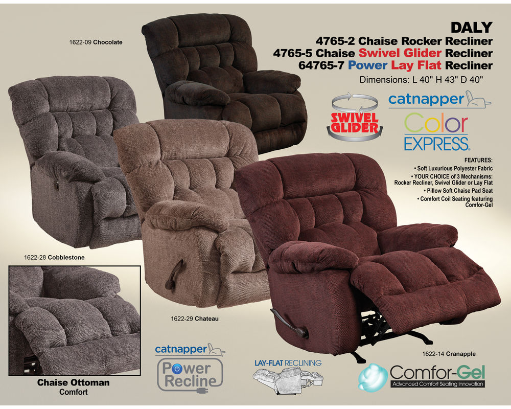 Traditional styling makes Catnapper's 4765 Daly Recliner the perfect addition to add relaxing comfort to your living area. Button-tufted seat backs and well-padded arms and ottoman contribute to the overall comfort of this lovely reclining chair. Choose from 4765-2 Daly chaise rocker recliner, 4765-5 Daly chaise swivel glider recliner, or 64765-7 Daly power lay-flat recliner.