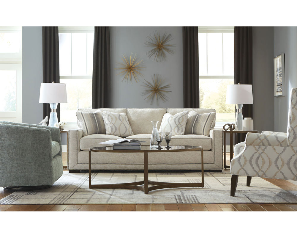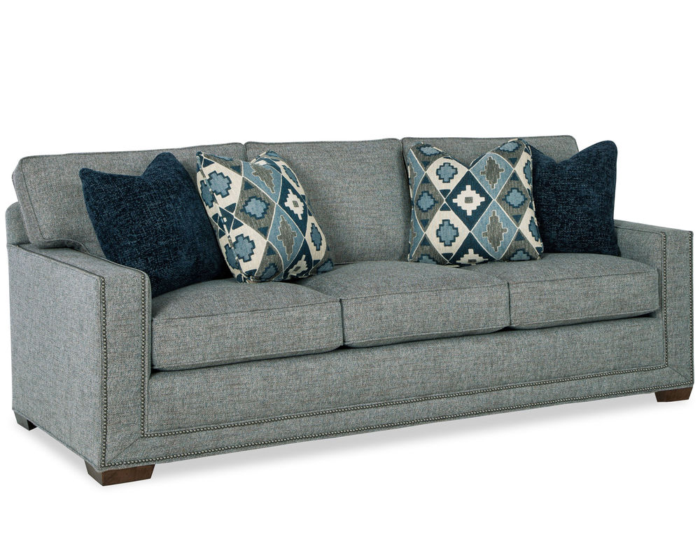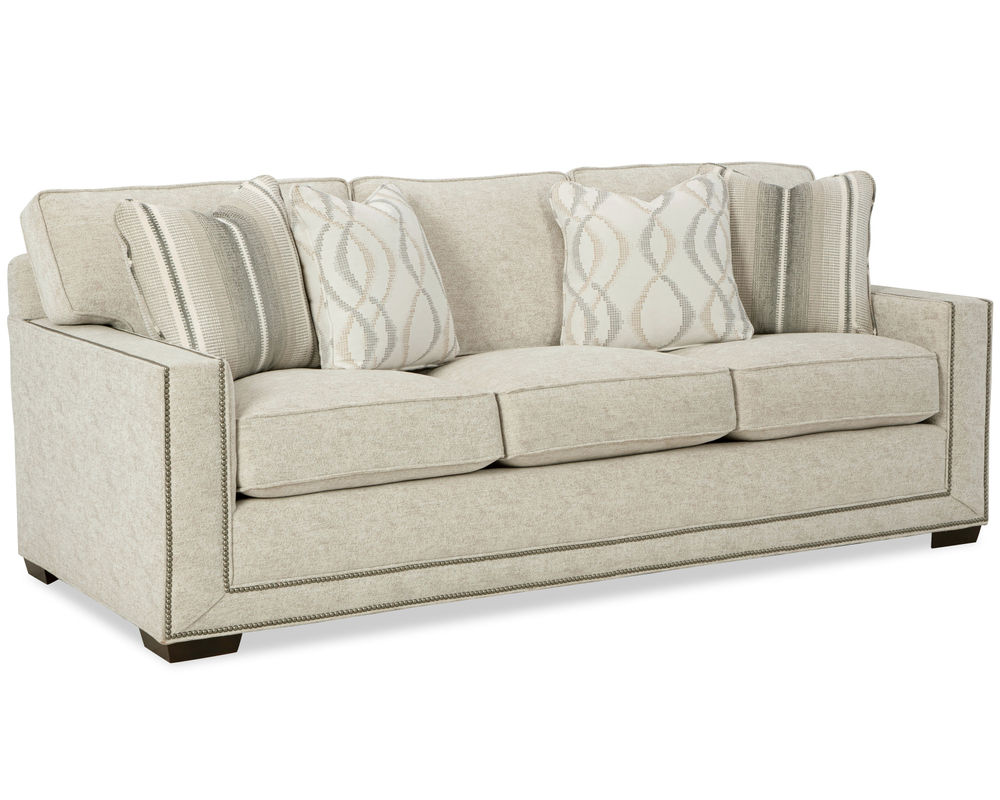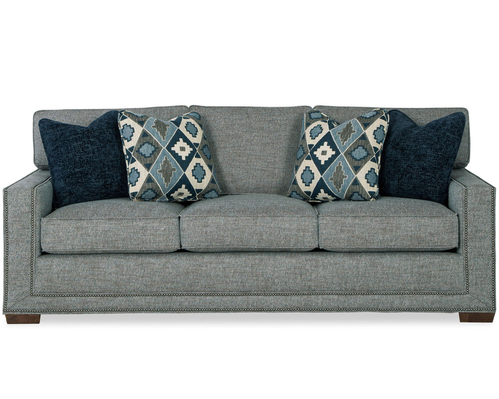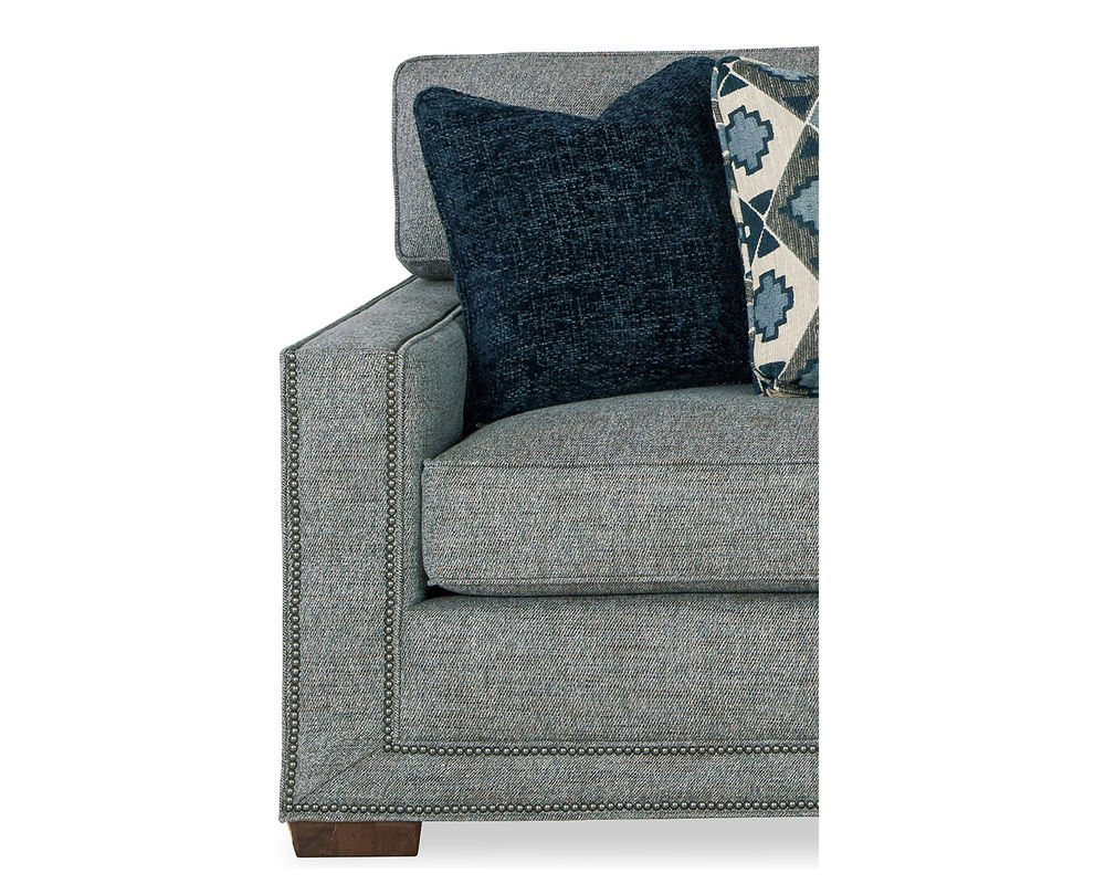 This Daniel 7232 Nail Head Sofa from the New Traditions collection is a bold and dramatic piece of furniture that will make a statement in any living space. Featuring wide track arms and loose box-border backs, this sofa is perfect for those who appreciate sophisticated style. The plush Blend Down seat cushions ensure long-lasting comfort and the arms and base are elegantly trimmed with double rows of small nail heads to give the effect of a picture frame around this artful piece. To complete the look, the matching loveseat, stationary chair, swivel chair and ottoman are available, making it easy to create a timeless and elegant living room. Whether you’re looking for a classic style or a modern take on traditional, this Daniel Nail Head Sofa will be the perfect addition to your home.