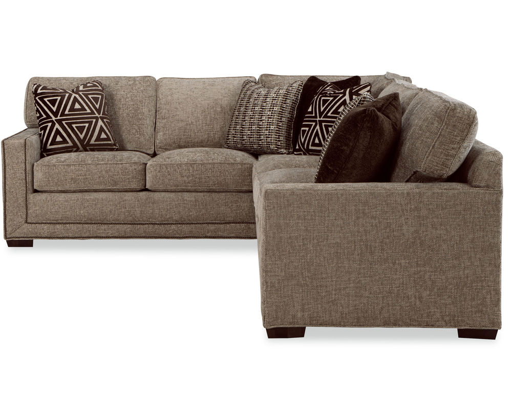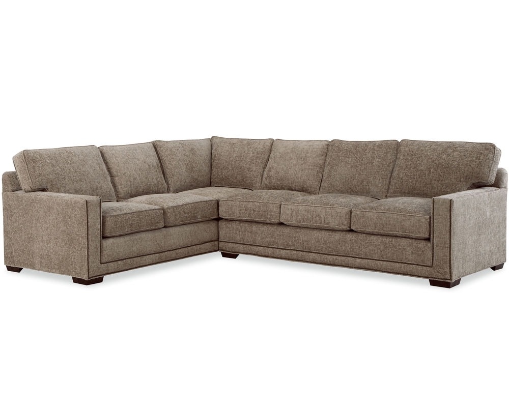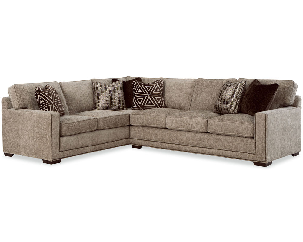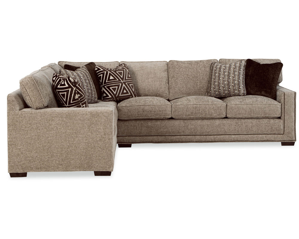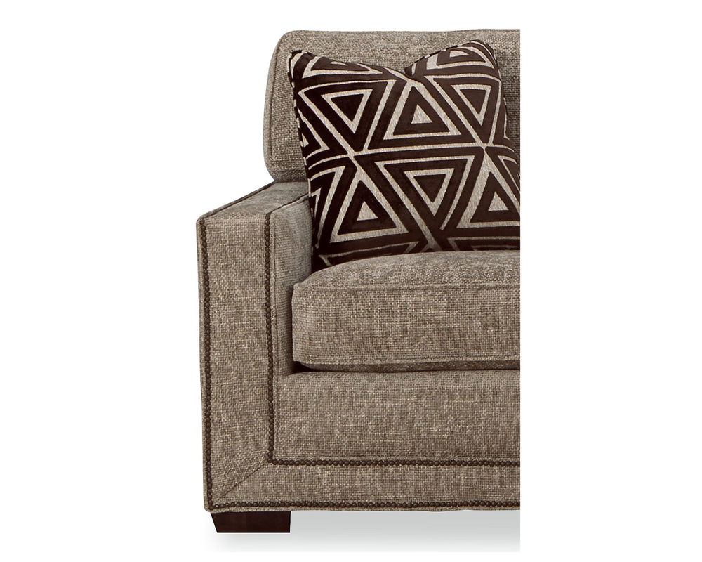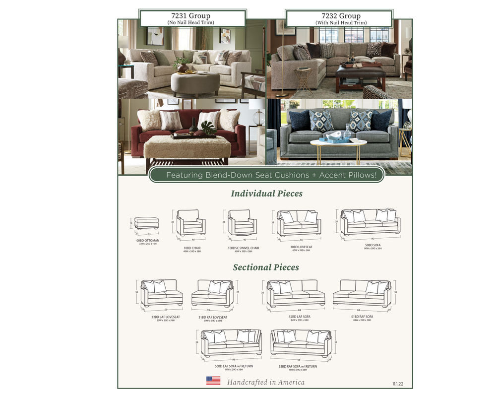 The Daniel 7232 Sectional from the New Traditions collection is the perfect addition to your living space. This bold and dramatic piece features wide track arms, loose box-border backs, and plush Blend Down seat cushions and toss pillows. The arms and base are elegantly trimmed with double rows of small nail heads to give the effect of a picture frame around each piece. With 6 pieces available, you can create a configuration to perfectly suit your space. The collection also includes the matching sofa, loveseat, stationary chair, swivel chair, and ottoman, all available in over 100 performance fabrics. Put the Daniel 7232 Sectional in your home and enjoy its style and comfort for years to come.