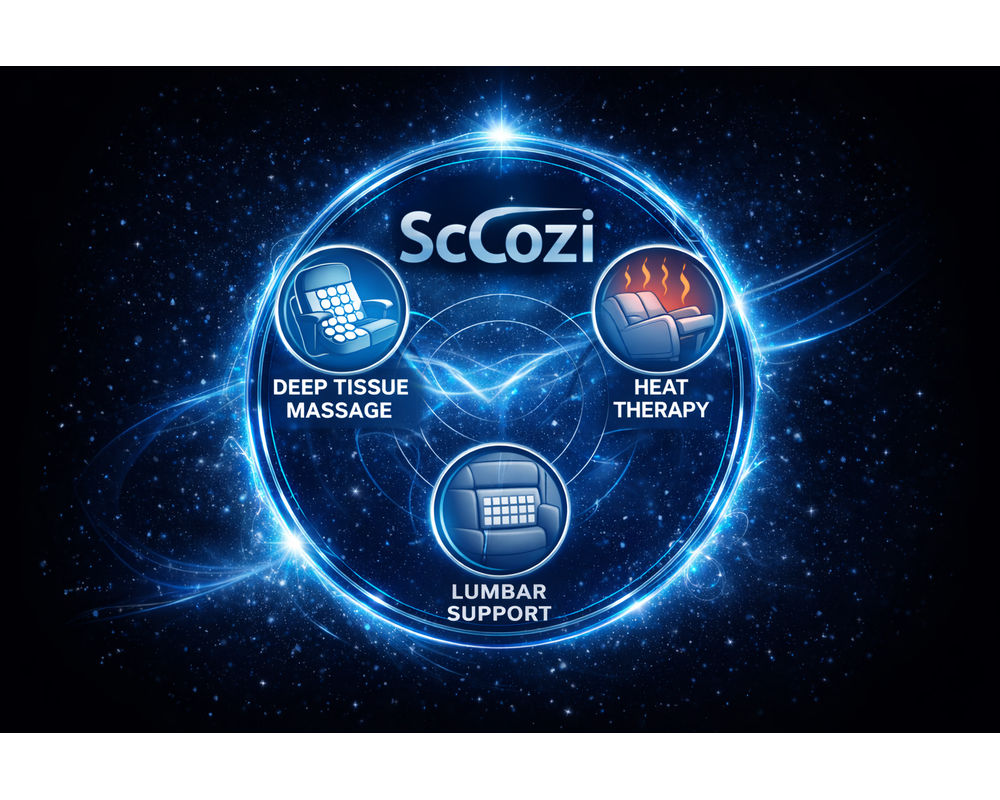 The SoCozi Massage Recliner features a deep tissue air cell massage system designed to deliver targeted relief exactly where your body needs it. Strategically placed air cells gently inflate and deflate to create a rhythmic, kneading motion that mimics hands-on massage, while integrated deep heat penetrates muscles to enhance relaxation, improve circulation, and increase blood flow. The added heat helps loosen tight areas, relieve stiffness, and amplify the effectiveness of the massage, making it especially beneficial for lower back discomfort and everyday aches. Together, the air cell massage and heat therapy reduce pressure points, ease muscle tension, and provide a deeper, more restorative experience than traditional vibration massage—promoting relaxation, better sleep, and overall wellness.
