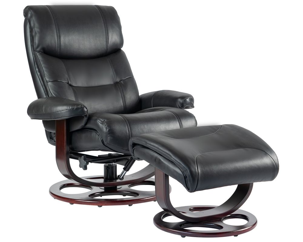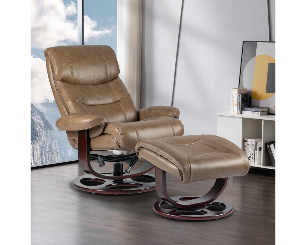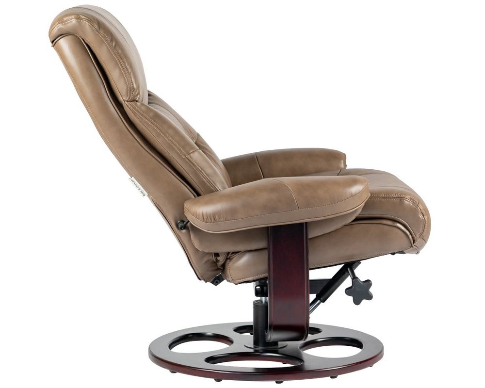 The angled ottoman is designed to position your legs perfectly for maximum relaxation. The recliner mechanism, designed for your convenience, allows you to easily adjust and lock the chair to your desired comfort zone. The heavy-duty wood base is finished in a beautiful Cappuccino finish, adding a touch of elegance to any room.