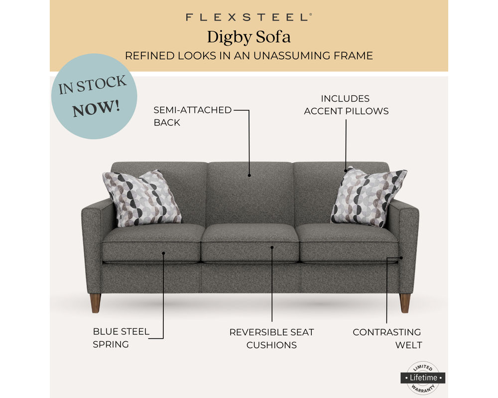 The Flexsteel Digby 5966 Sofa is the perfect addition to any living space. Its slim, tapered arms and tightly padded back create a roomy yet sophisticated look that will elevate the style of any room. With its exclamation-point arm and tall tapered legs, this sofa adds visual height and a touch of modern elegance. The tight back design not only enhances the architectural feel of this piece but also provides unexpected comfort. Whether you have a small living room or a spacious den, the Digby sofa is a versatile choice that will fit seamlessly. It is currently in stock and ready to be a stylish and comfortable addition to your home.