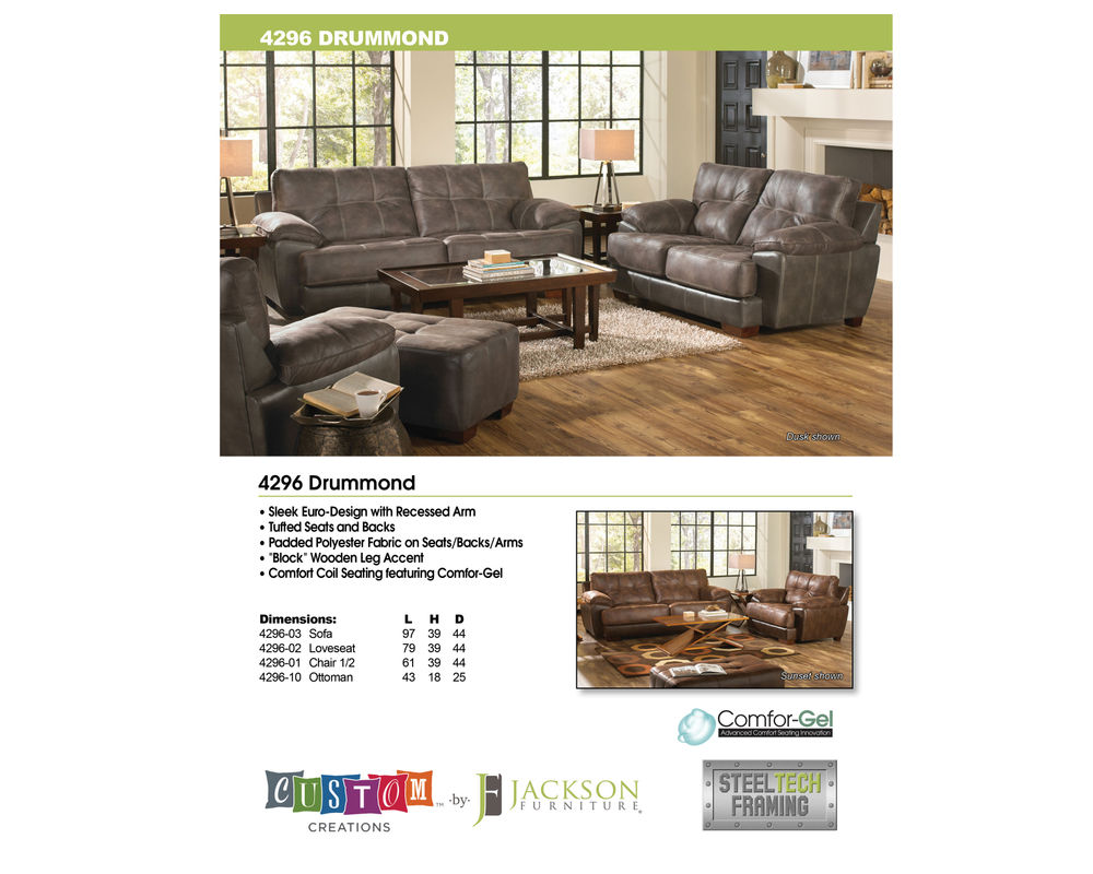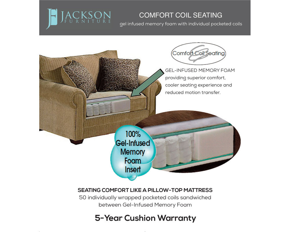 Excellent loft within the channels gives this sofa just the right amount of support and body-surrounding comfort. The Jackson Furniture line's Comfort Coil Cushion system is unmatched in support and durability. Fifty individually pocketed foam-encased coils within the cushion allow independent movement resulting in a superior seating experience, while state-of-the-art gel-infused memory foam inserts cradle the user in cool, whisper-soft relaxation. Adding further value to the beauty and comfort of this fine furniture is the outstanding Lifetime Limited Warranty that Jackson Furniture includes for the frame and springs, as well as the 5-year warranty on the Comfort Coil Cushion system. Designed for comfort… Made to last.