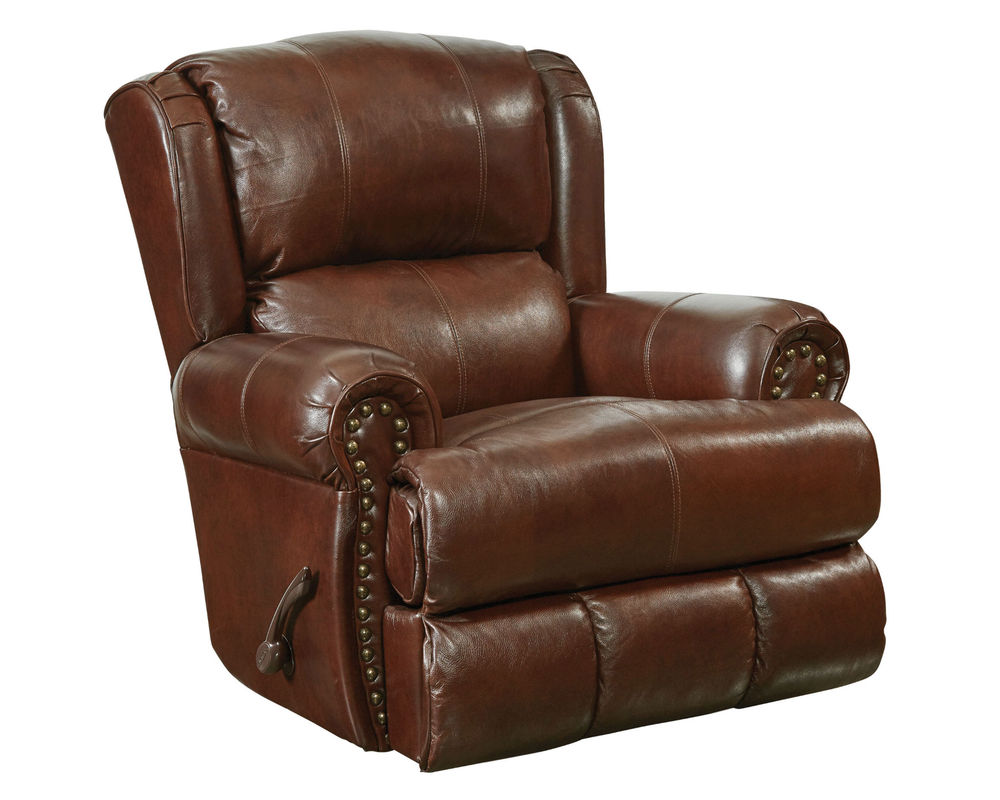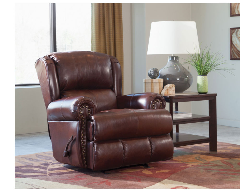 Traditional styled recliner featuring Top Grain Italian leather everywhere your body touches. Brass Nailhead accents combined with the Lay-Flay (Like a bed) reclining mechanism makes this recliner stylish and comfortable. Comfort Coil seat cushions with infused comfort gel.