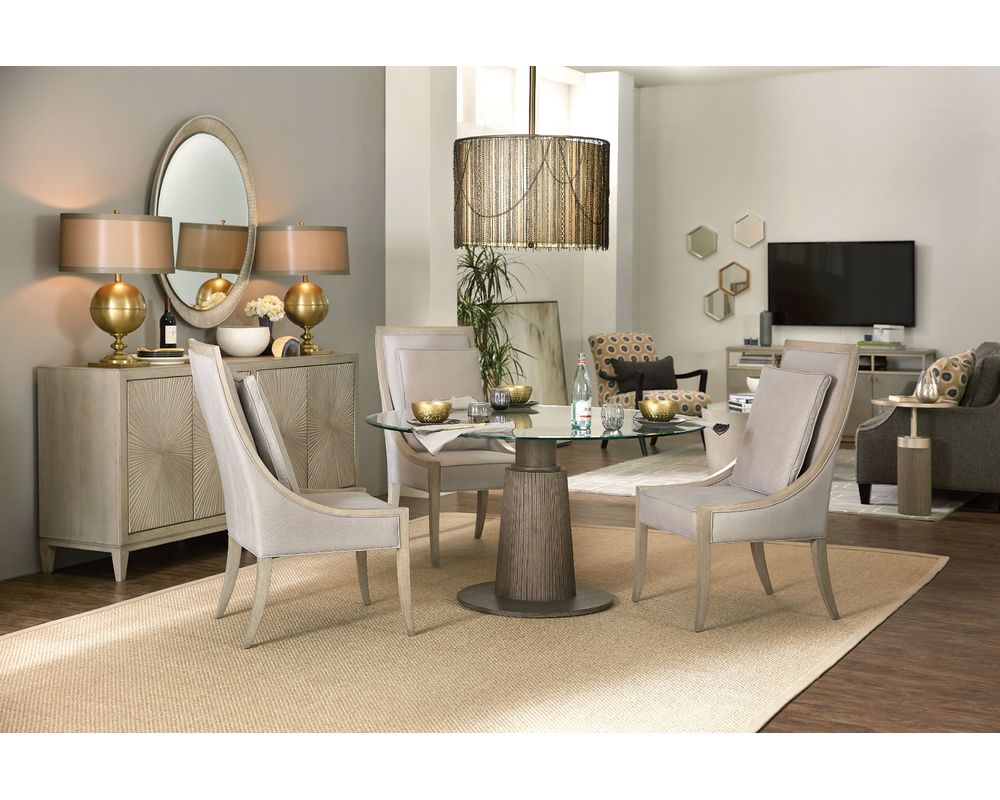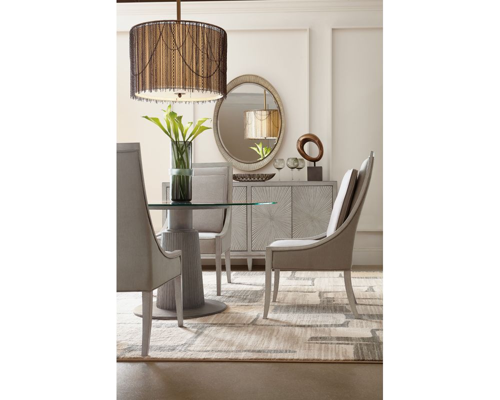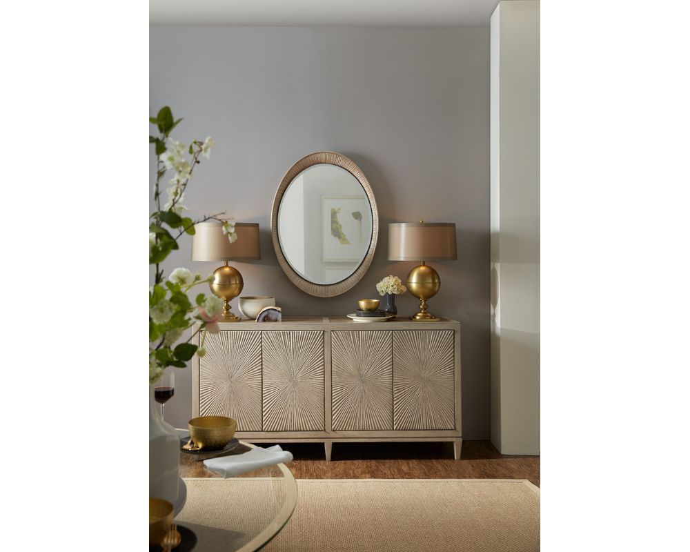 Elixir is a casual contemporary collection that, like its name implies, exudes a feeling of comfort, simplicity and well-being. While Elixir has crisp, clean lines, character and visual interest are also achieved through the use of texture. Textural interest comes from the use of lightly sand-blasted walnut veneer, light texture applied to the metal elements along with a hand-carved texture added to the surface of select pieces such as the oval mirror and the round dining table. The buffet offers a beautiful carved starburst pattern on the doors.