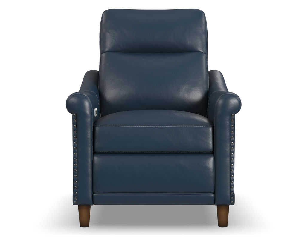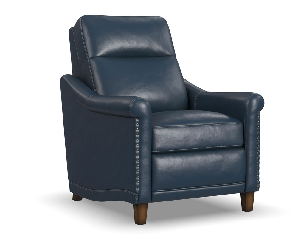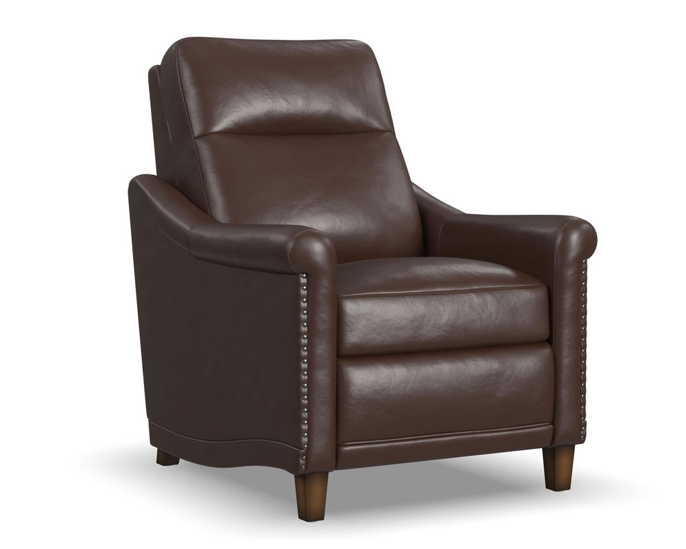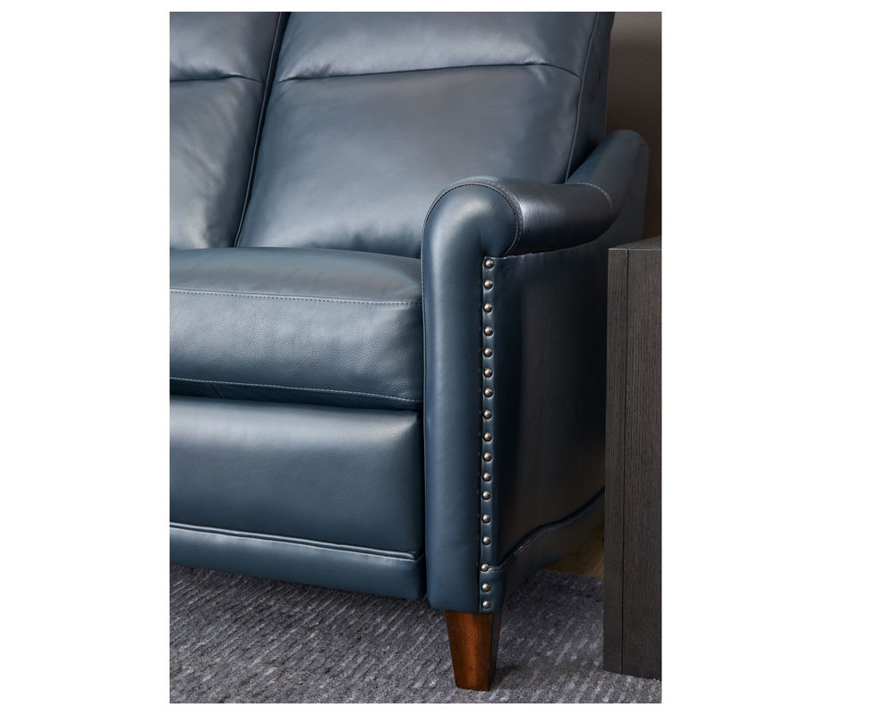One of the standout features of the Elizabeth recliner is its tightly rolled arm, accented by silver nail head trim. This adds a touch of glamour and elegance to the overall design, making it a perfect addition to any home decor. The solid wood feet complement the contrast stitching, making it look sleek and polished.