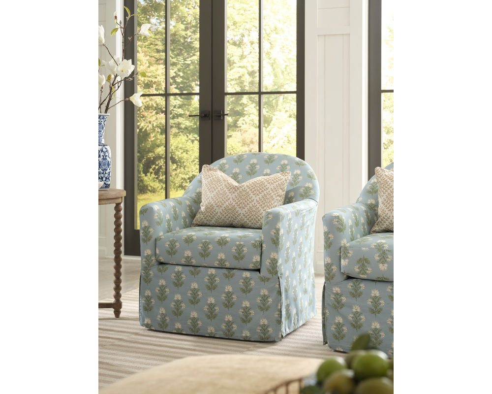 The Meg Swivel Chair brings graceful motion and classic styling together in one beautifully tailored seat. With a contoured barrel back that flows seamlessly into softly rolled arms, Meg feels both sculptural and inviting—made even more charming by its tall front deck and slipcover-inspired skirt.