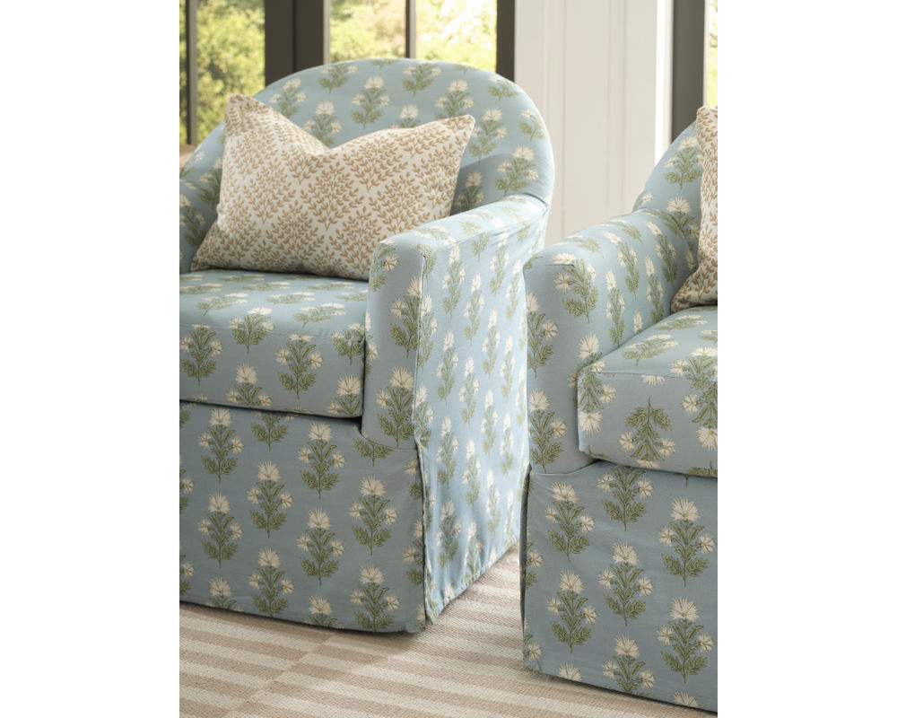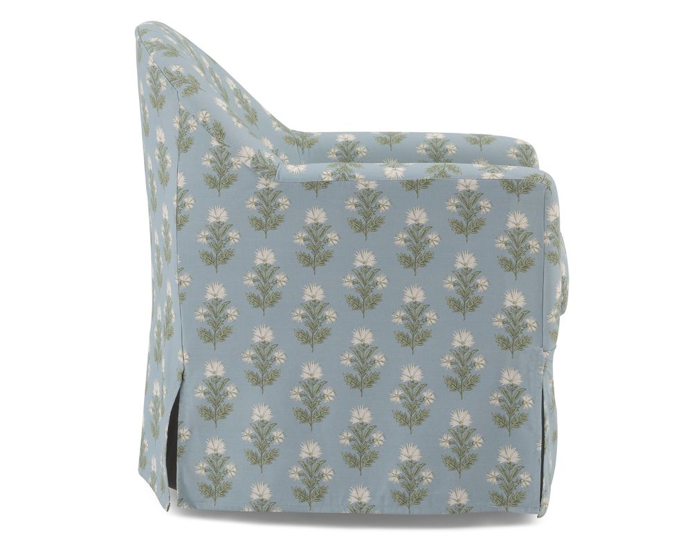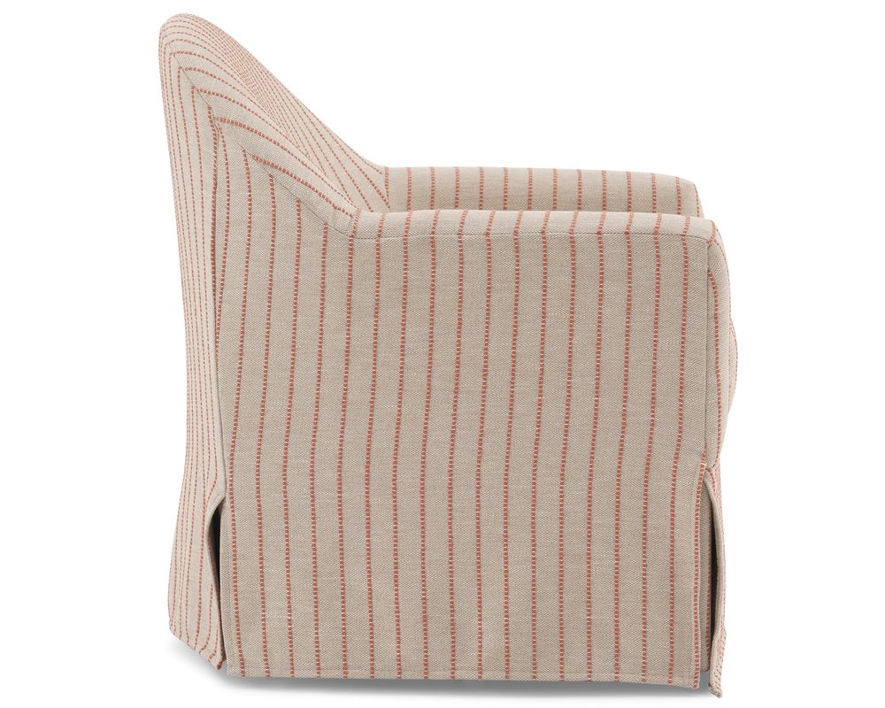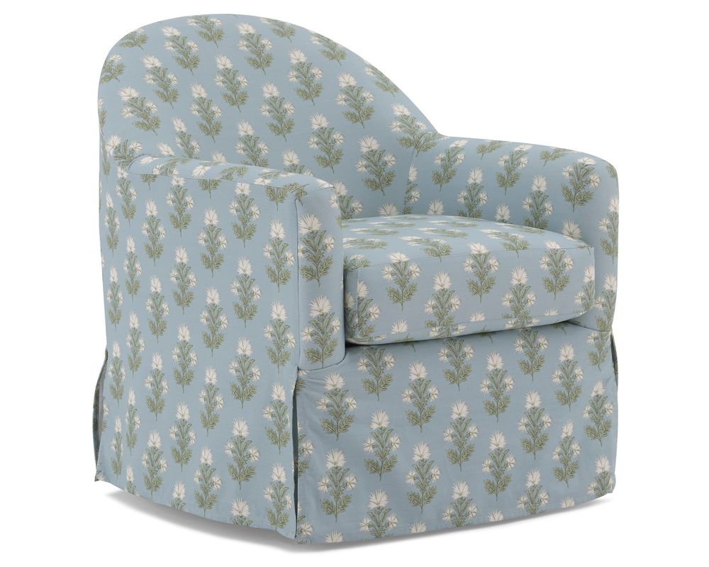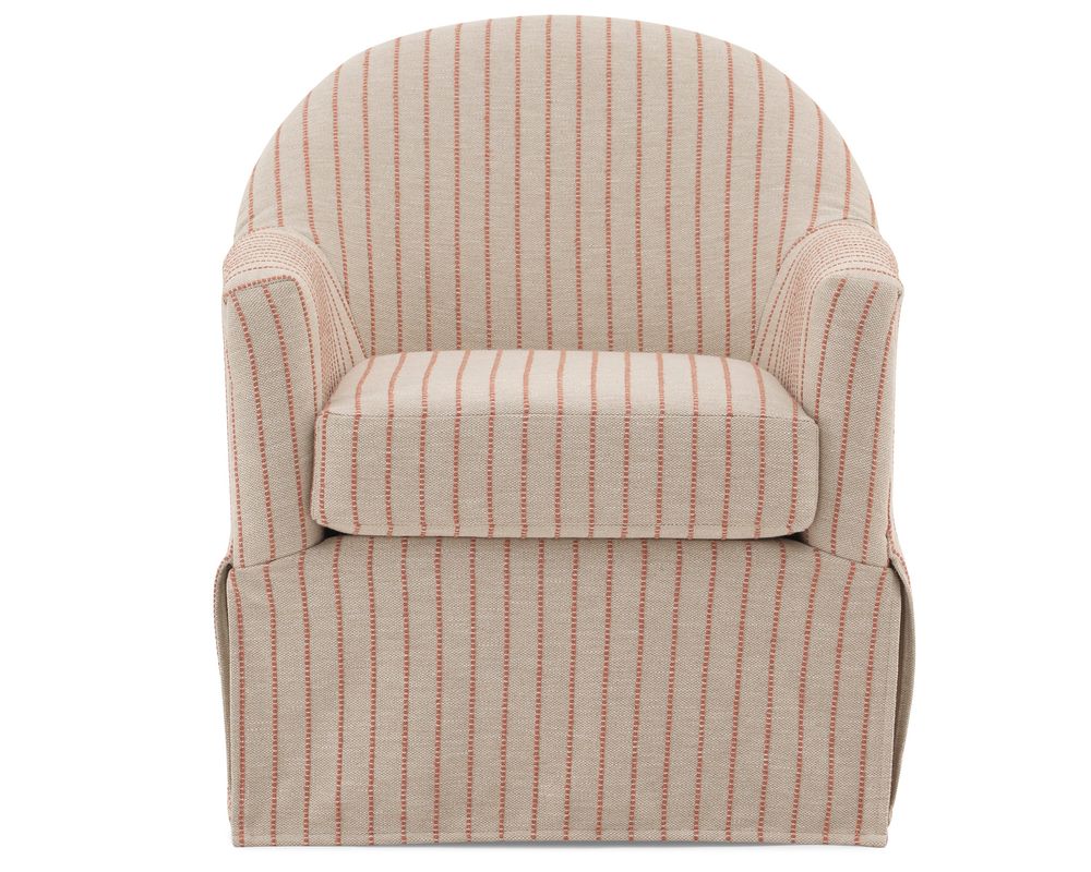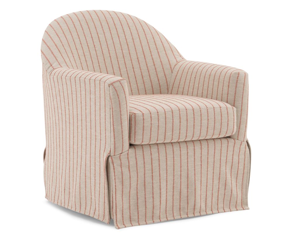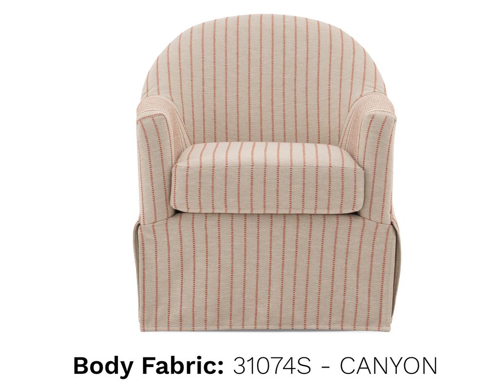 The Meg Swivel Chair brings graceful motion and classic styling together in one beautifully tailored seat. With a contoured barrel back that flows seamlessly into softly rolled arms, Meg feels both sculptural and inviting—made even more charming by its tall front deck and slipcover-inspired skirt.