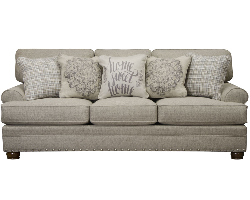 Introducing the Farmington 4283 Sofa from Jackson Furniture! This beautiful piece of furniture is the perfect addition to any home. Its soft chenille fabric adds a touch of sophistication with a correlating print pillow for extra comfort. The Farmington 4283 Sofa is designed to bring a farmhouse casual style to your living space with an extra deep T-Cushion for ultimate comfort. The reversible seat cushions and attached bordered backs provide extra detail and style, while the individual hand drivel brass nails add an extra touch of luxury. This piece of furniture is sure to bring a cozy, home-sweet-home mood to your home.