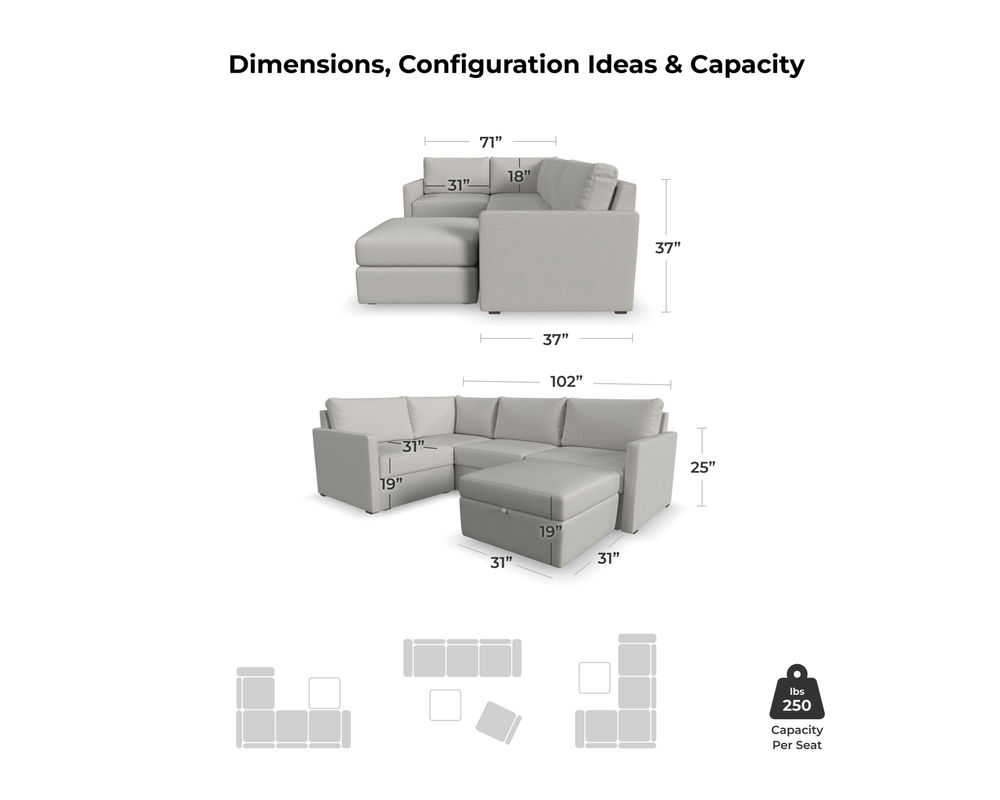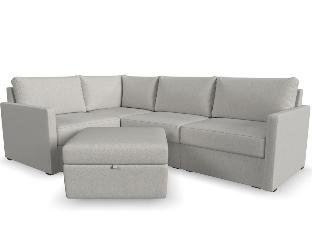 Designed for a lifetime of flexibility, the Flex 4-Seat Sectional with Storage Ottoman can easily contract or expand as your needs change. Use the ottoman as a standalone piece or combine it with other modular components to create the perfect seating configuration for your space. Built with Blue Steel Spring technology and sustainable, stain-resistant performance fabric, Flex seating provides deep-seated, blissful comfort and long-lasting livability. And assembly is a breeze with a patented J-bracket “no-tool” method that takes minutes, rather than hours.