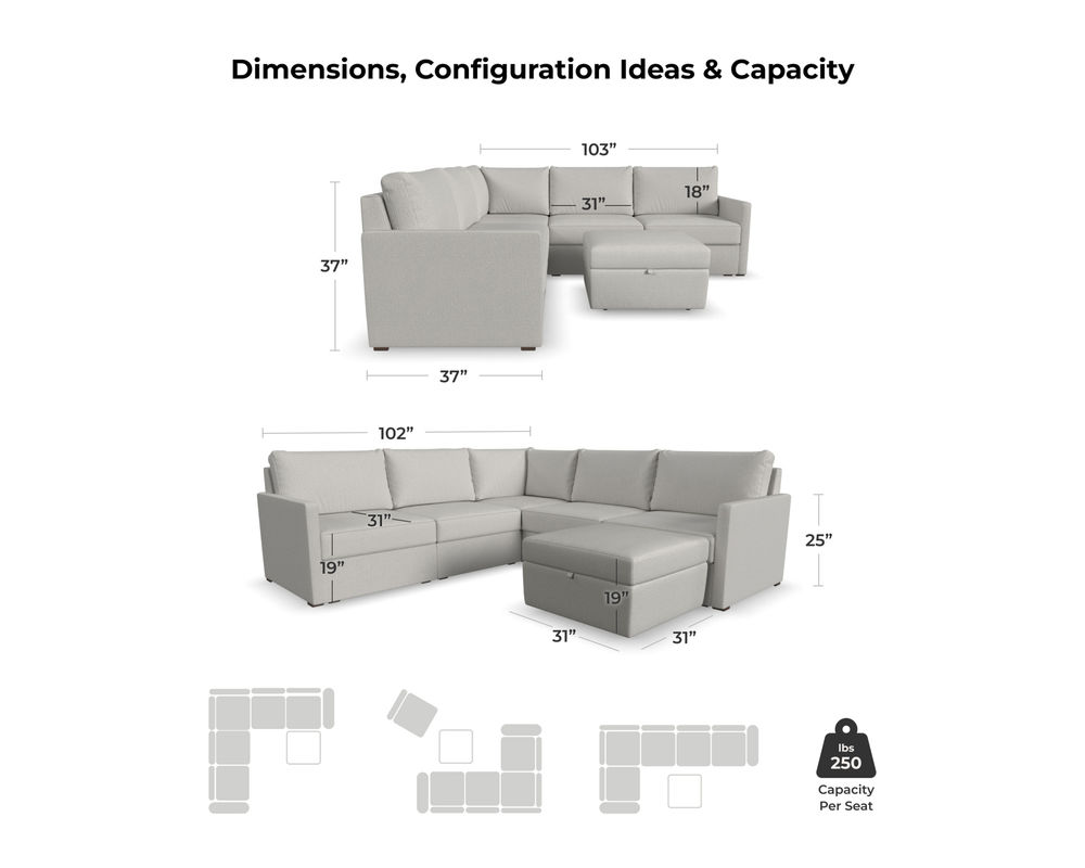 Designed for a lifetime of flexibility, the Flex 5-Seat Sectional with Ottoman can easily contract or expand as your needs change. Use the ottoman as a standalone piece or combine it with other modular components to create the perfect seating configuration for your space. Built with Blue Steel Spring technology and sustainable, stain-resistant performance fabric, Flex seating provides deep-seated, blissful comfort and long-lasting livability. And assembly is a breeze with a patented J-bracket “no-tool” method that takes minutes, rather than hours.