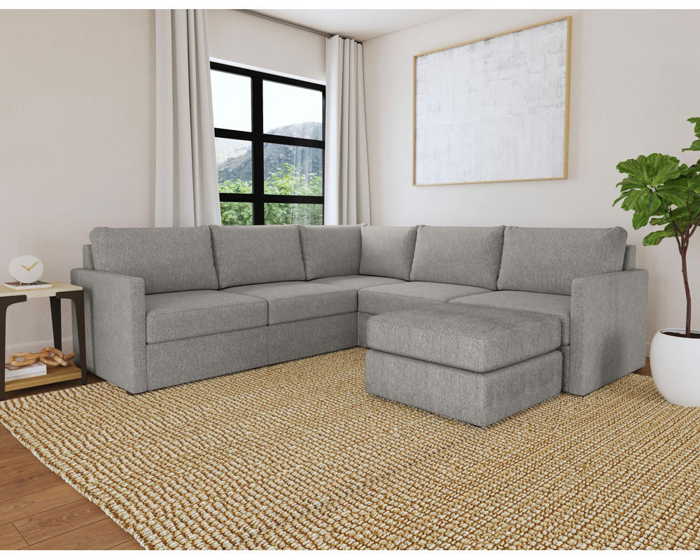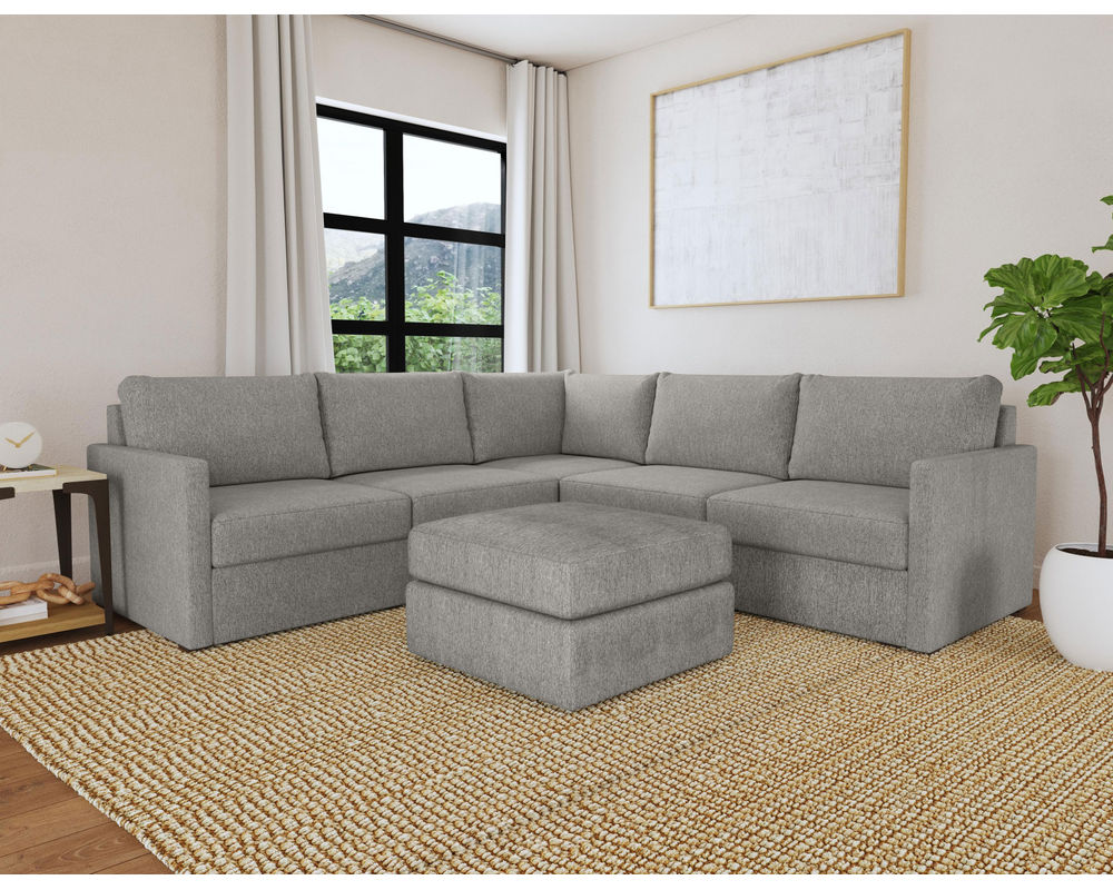 Designed for a lifetime of flexibility, the Flex 5-Seat Sectional with Ottoman can easily contract or expand as your needs change. Use the ottoman as a standalone piece or combine it with other modular components to create the perfect seating configuration for your space. Built with Blue Steel Spring technology and sustainable, stain-resistant performance fabric, Flex seating provides deep-seated, blissful comfort and long-lasting livability. And assembly is a breeze with a patented J-bracket “no-tool” method that takes minutes, rather than hours.