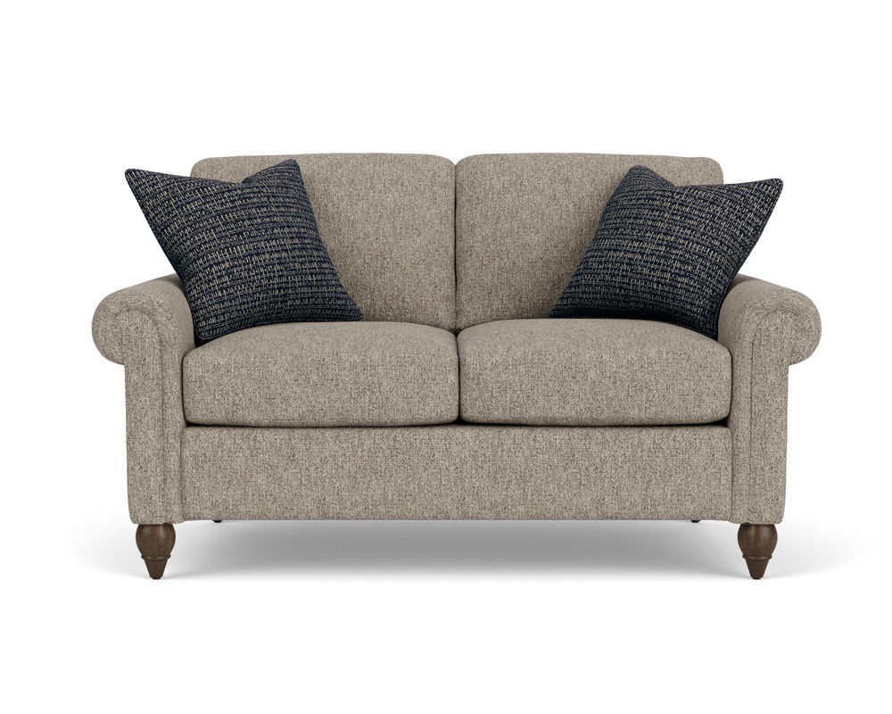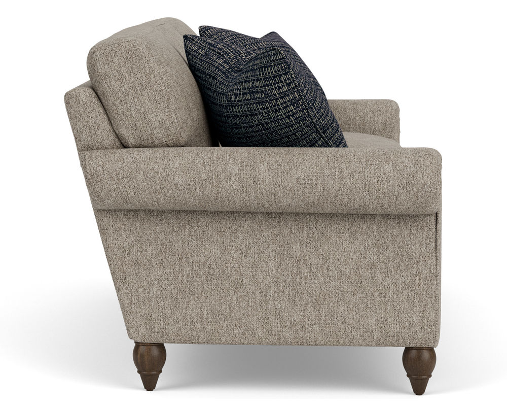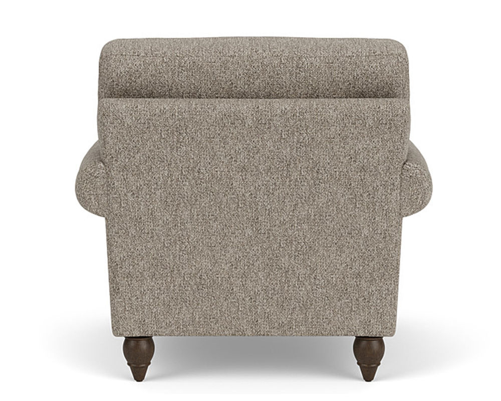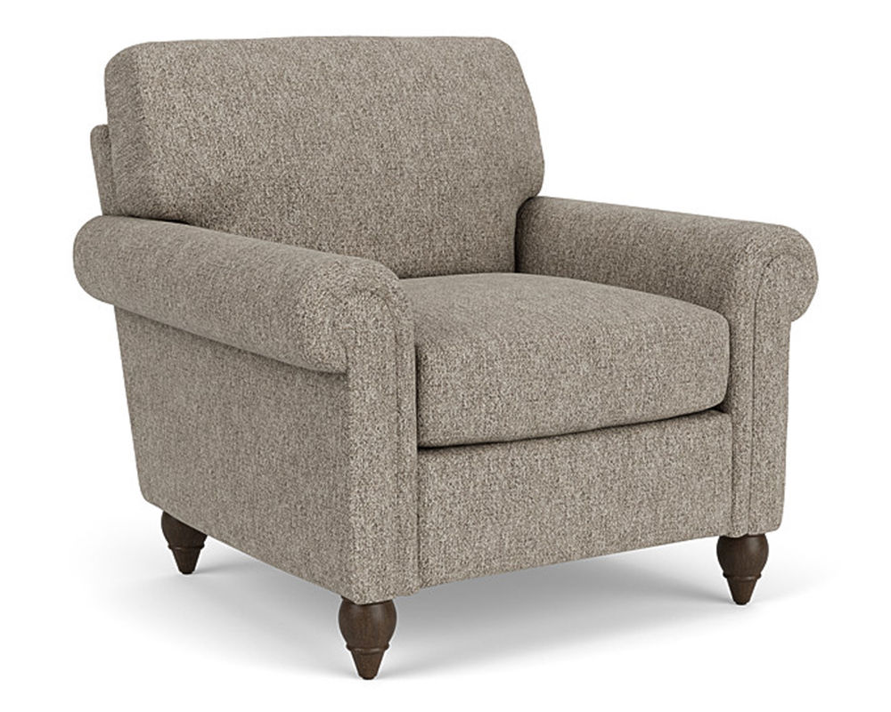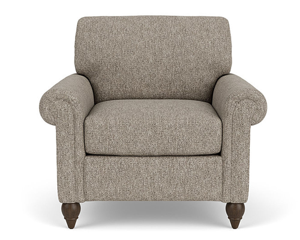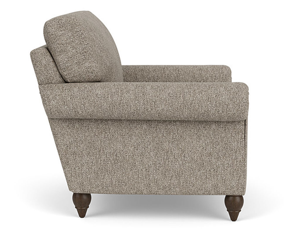The Flexsteel chair ensures you never have to settle for anything other than the perfect design, no matter your style. Formal panel roll arms sit on round turned legs that are available in three distinct wood finishes-Florentine, Valencia, or Urban Renewal-to complement any decor. The removable T-shaped seat cushion offers a distinctive look and added comfort. Sink into the ideal level of support with your choice of our luxury or plush cushion. Complete the look and showcase your lifestyle with hundreds of different fabric choices, including high-performance and sustainable textiles. Superior frame construction and our patented C-Flex Blue Steel Springâ„¢ ensures your Flexsteel Living Room can be enjoyed for years to come.