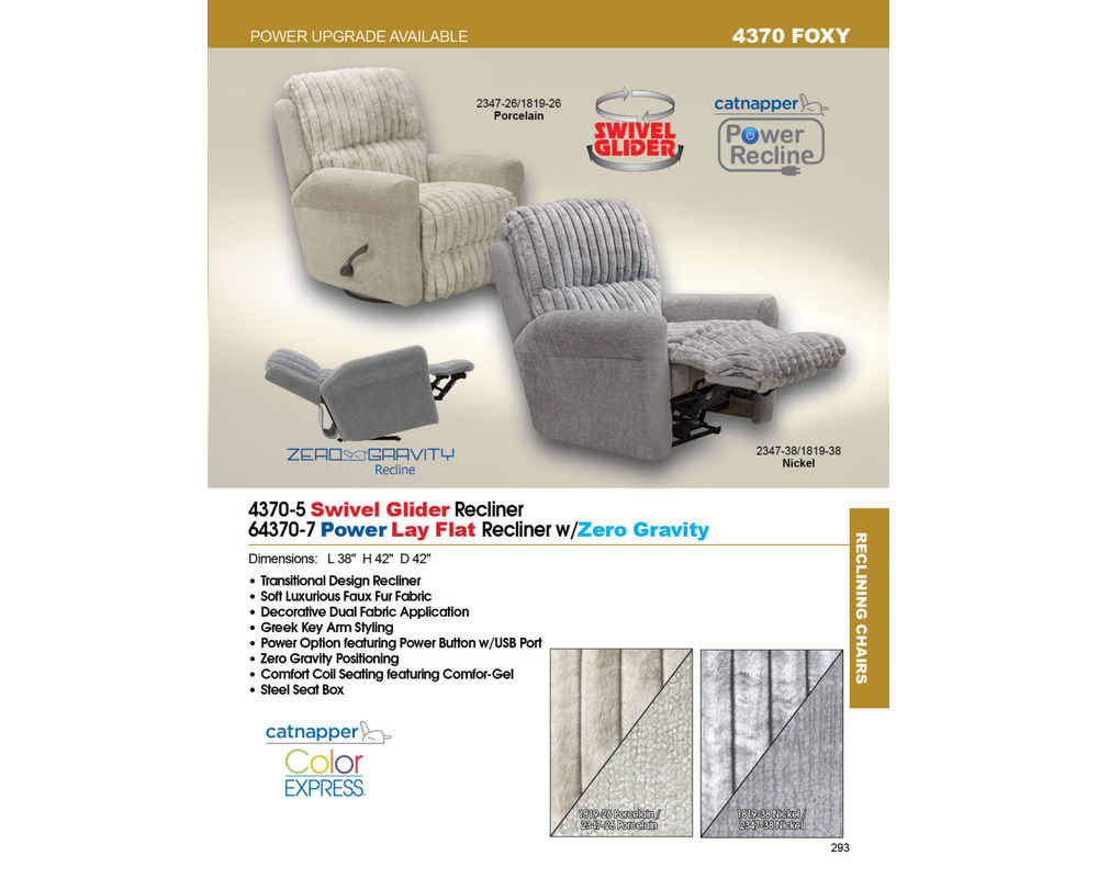 Introducing the Foxy 4370 Recliner—the perfect blend of comfort, style, and durability. Available in two options—a swivel glider recliner or a zero-gravity Lay-Flat power recliner—this recliner is sure to cater to all your relaxation needs.