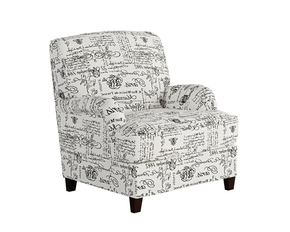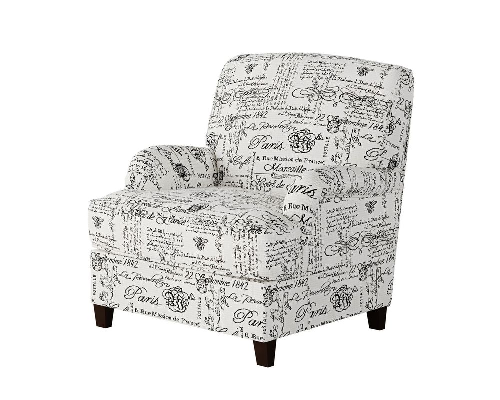The chair's tight back is sloped, adding visual interest and making it versatile. It can be coordinated with our Dizzy Iron Sofa or Sectional Collection or used as a standalone statement piece in any room. The fabric features a beautiful French script design. It is made of 100% Polypropylene Olefin and Revolution fabric, which is highly stain-resistant and easy to clean. This makes it a practical and durable choice for any household.