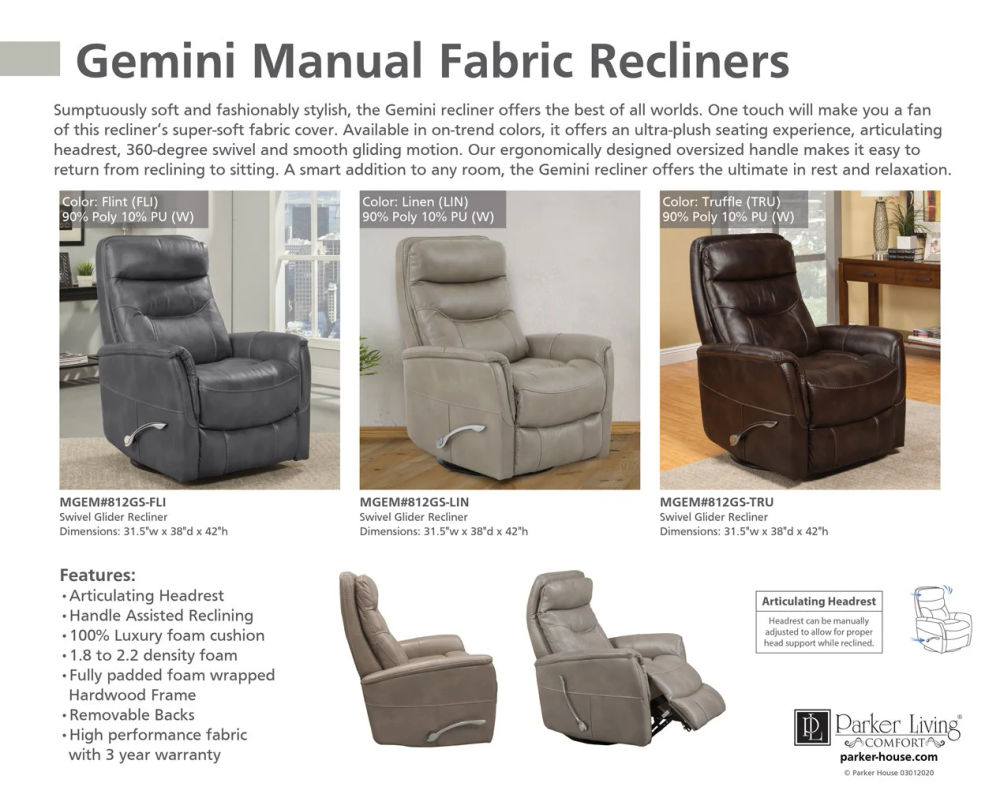 Experience the ultimate comfort and versatility with the Gemini Swivel Glider Recliner. Designed to be your go-to seat in the house, this multifunctional recliner combines the best of everything. With just a simple pull, you can easily open and close the recliner, allowing you to find your perfect position for relaxation.