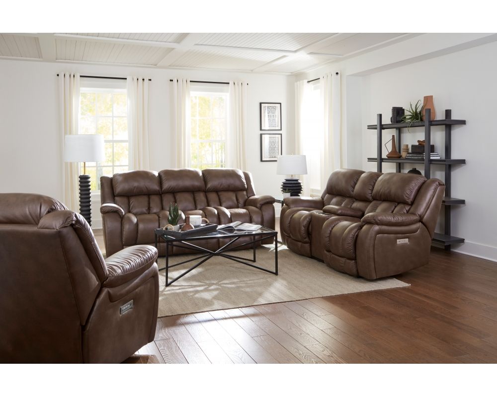 The Global Reclining Console Loveseat offers luxurious comfort, ergonomic support, and modern convenience. Upholstered in leather-like fabric, it features power recline, power headrest, and power lumbar on both seats for a fully customized lounging experience.