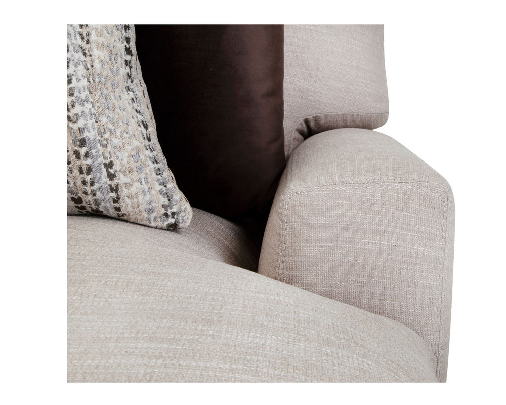 A transitional sectional with a contemporary attitude, Franklin's 808 Hannigan Sectional is a wonderfully cool neutral palette that makes it home quickly in various color schemes, allowing several color pop choices. Printed and textured accent pillows add layers of contrast to the versatile seating. The three-piece pale gray sectional employs wide track arms with loose seat T-cushions and backs, making reversible cushions a convenient feature. A coordinating ottoman is also available for purchase. "Comfort Grid Seat Cushions" enhance the seating experience and extend cushion durability via the exclusive use of extra-thick seat cushions. Because Franklin fabricates its own foam, stamps its reclining mechanisms, and cuts its wooden frames, it can stand behind its American-made product with the best warranty in the industry. Franklin demonstrates their obsession with quality and passion for their product with a lifetime warranty on the reclining mechanism, all other metal parts, and wooden frame parts.