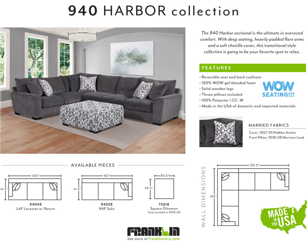 Crafted with high-quality materials, the Harbor 940 Sectional is built to last. The soft chenille cover adds a touch of elegance and sophistication to your space while providing a cozy feel. The transitional style of this collection makes it a versatile piece that can easily complement any decor in your home.