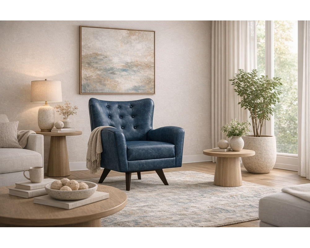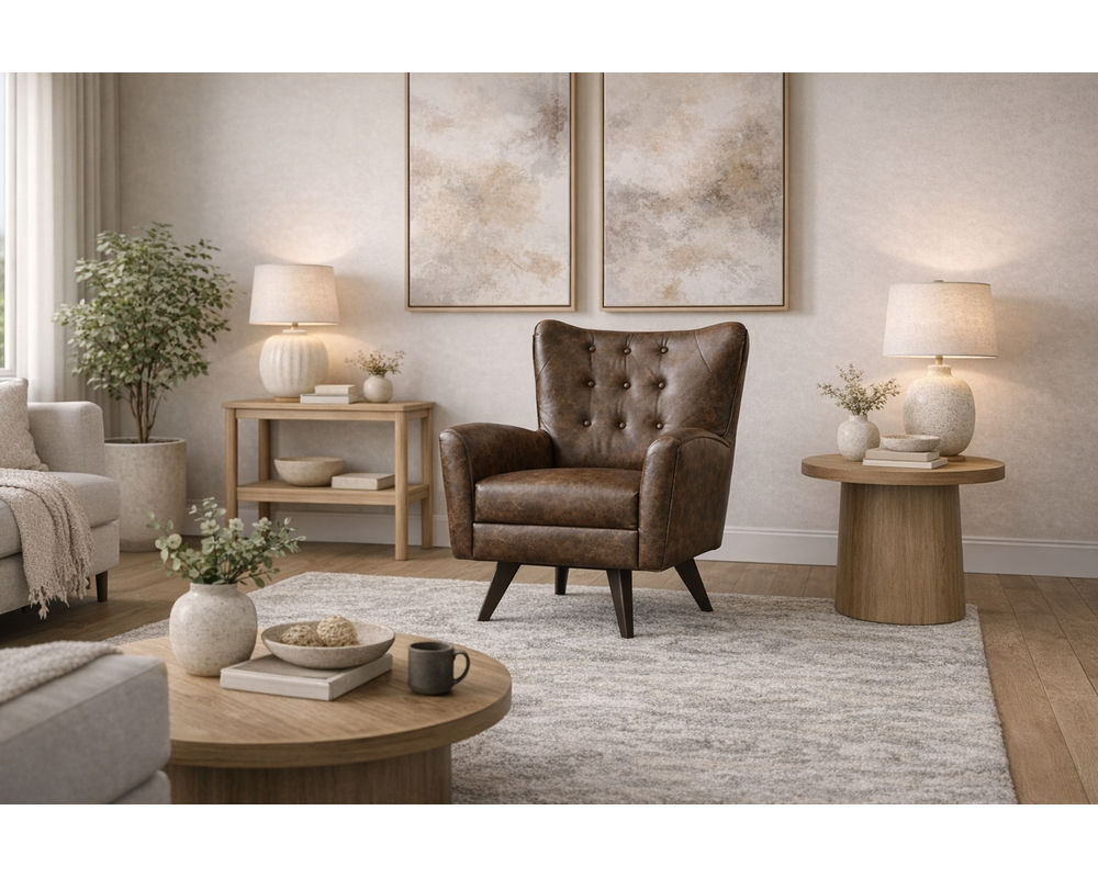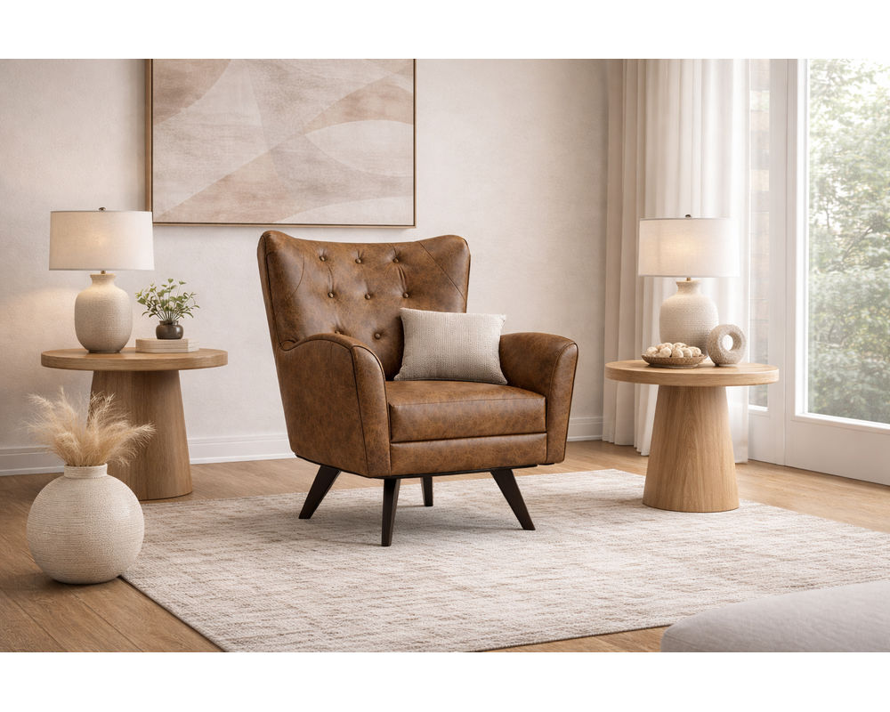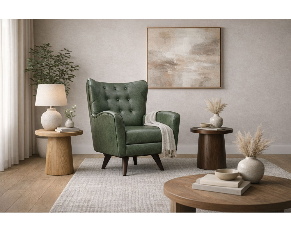 Designed with a sculptural button-tufted wingback and gently flared arms, the Harlow creates a striking silhouette that feels both sophisticated and inviting. The tailored leather upholstery enhances every curve, giving the chair a polished, upscale presence that works beautifully in living rooms, offices, or curated reading spaces.