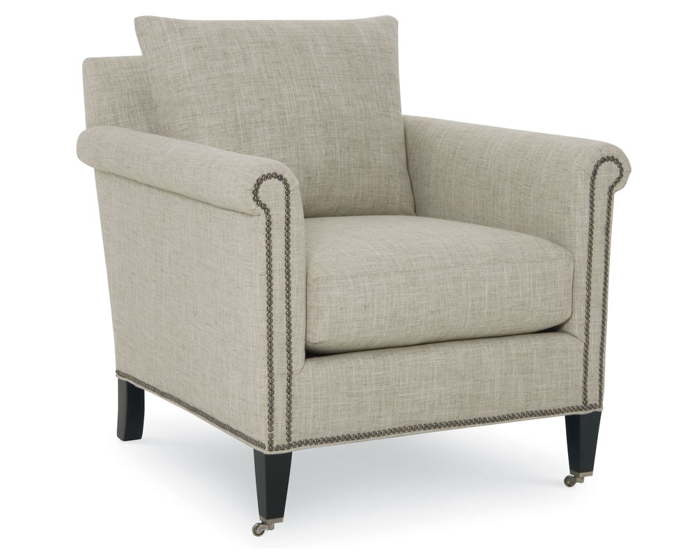 Sofas and Sectionals introduce the Havenwood Chair from CR Laine, a timeless and elegant addition to any living space. This traditional chair boasts a charming petite rolled arm design with exquisite nailhead trim along the front and base. The tapered wood legs add a touch of sophistication and are complemented by sturdy solid metal casters for easy mobility.