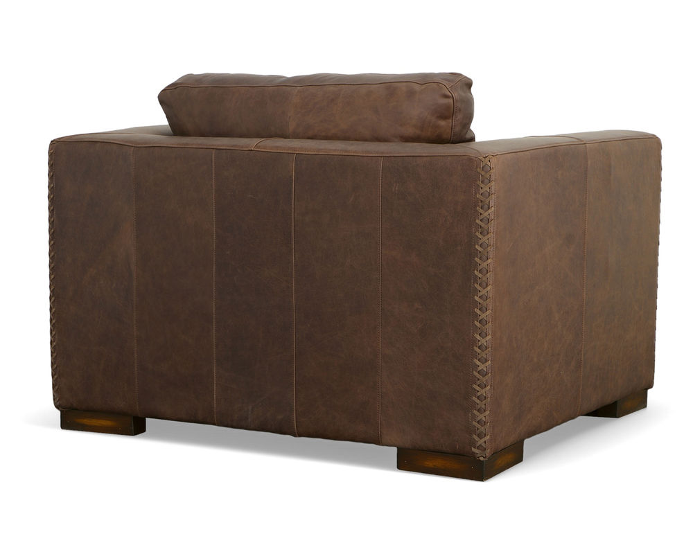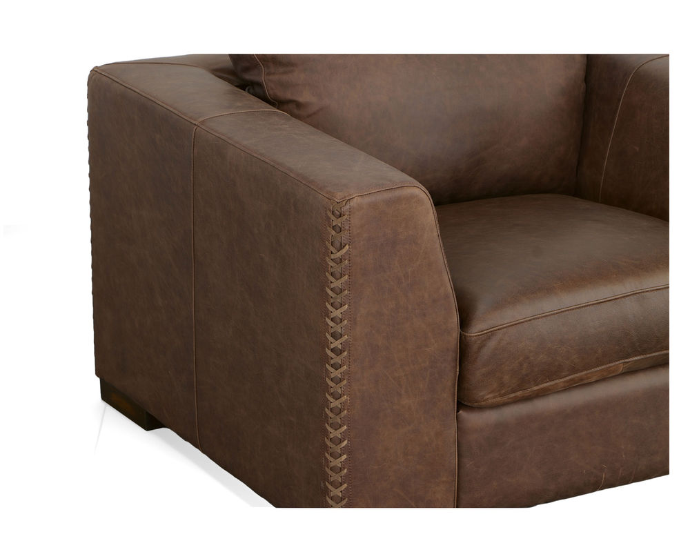 Introducing the Hawkins 1347 Leather Chair! This sophisticated chair is made with a square frame adorned with laced leather weave detail for an exquisite touch. The wide arms are accented with cross-stitching detail for a sleek look. The picture-frame back and square wooden feet at the base add to its crisp look. The box seat and flip-down center console bring beauty and function to the chair. It is available in two colors and is made of all leather for added comfort. Enjoy the luxurious appeal of the Hawkins 1347 Leather Chair in your home today!