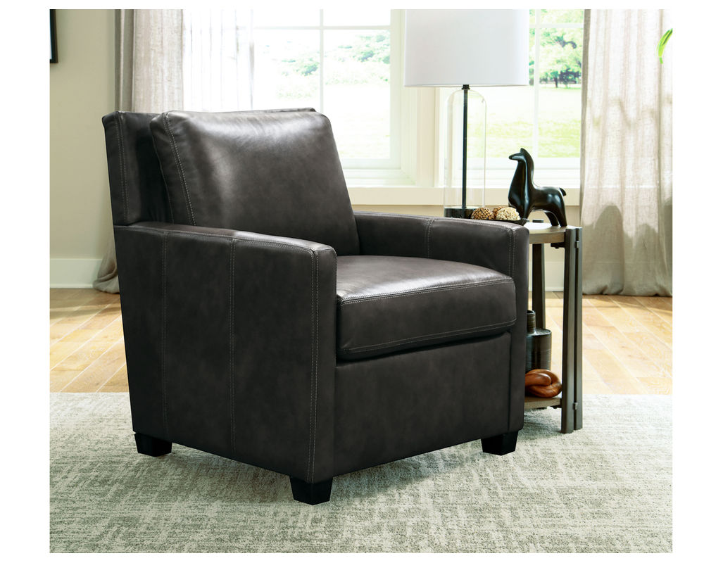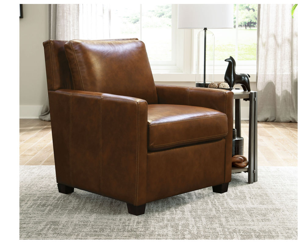 The Hayli 3904 Leather Chair is the perfect addition to any living space. With its simple silhouette, this chair is sure to complement any home style. The track arm and pyramid leg give it a distinctive, weltless look. Choose to cover it in any matched stripe/plaid, solid fabric or leather to make it truly yours! The soft, yet durable leather is perfect for anyone looking for a long-lasting and comfortable chair. With its high-quality construction, this chair will be a timeless piece in your home for years to come. Whether you're looking to add a touch of sophistication to your living room or create a cozy reading nook, the Hayli 3904 Leather Chair is the perfect choice.
