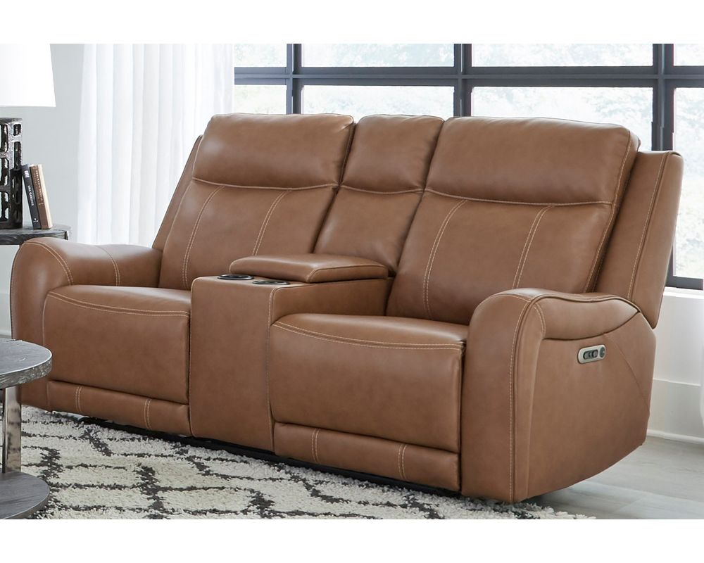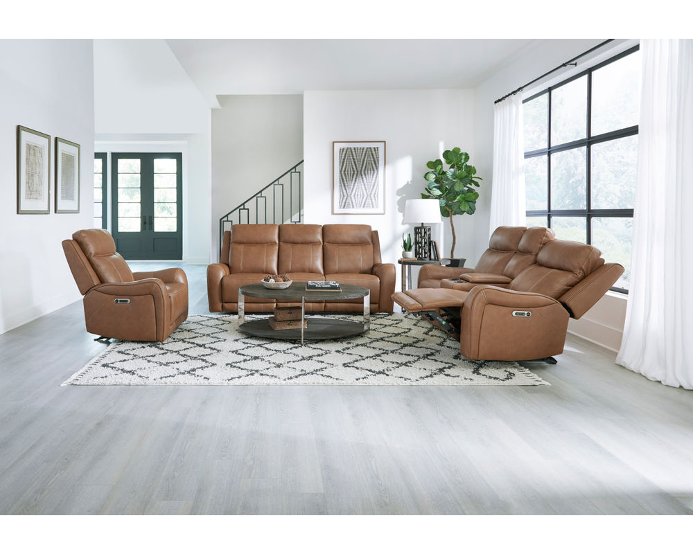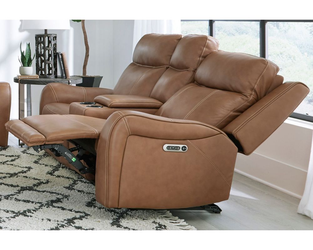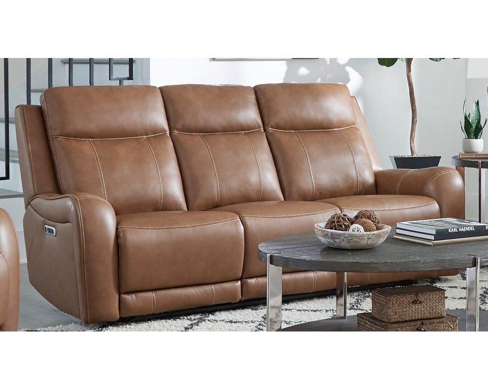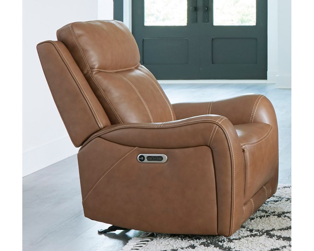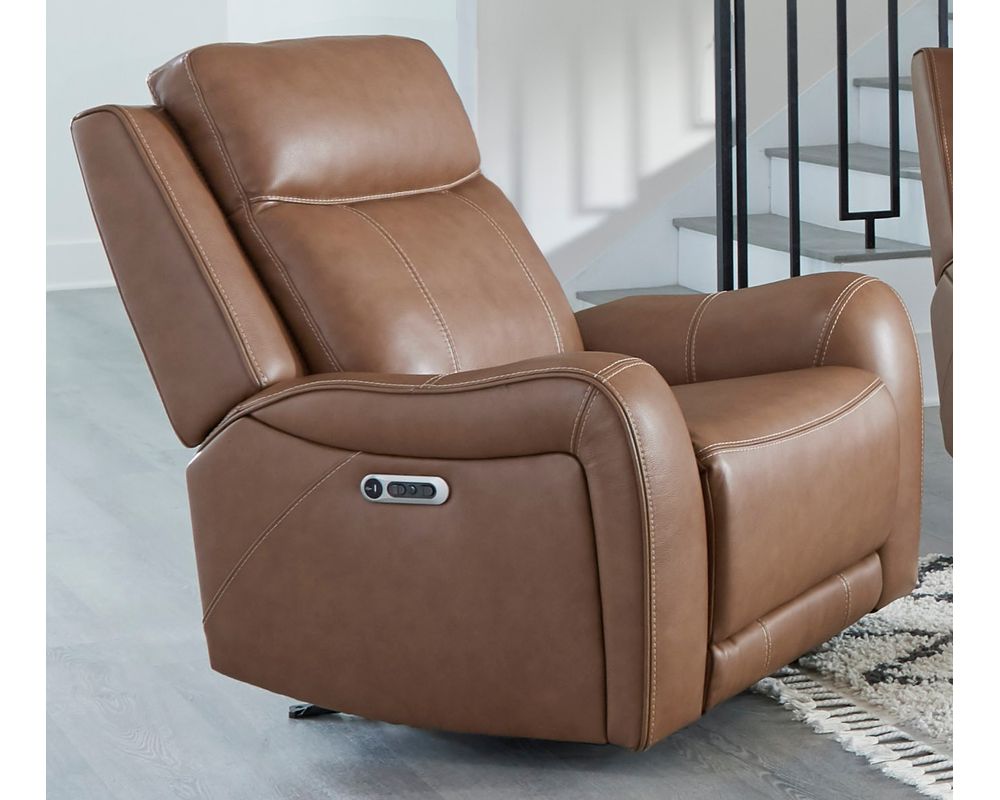 The Haywood Power Recliner is functional and boasts a stunning design. Its bold, padded, contoured arms with decorative stitching add a touch of elegance and sophistication to any room. The rich leather upholstery with a custom match adds a touch of luxury, making this recliner a statement piece in any space.
