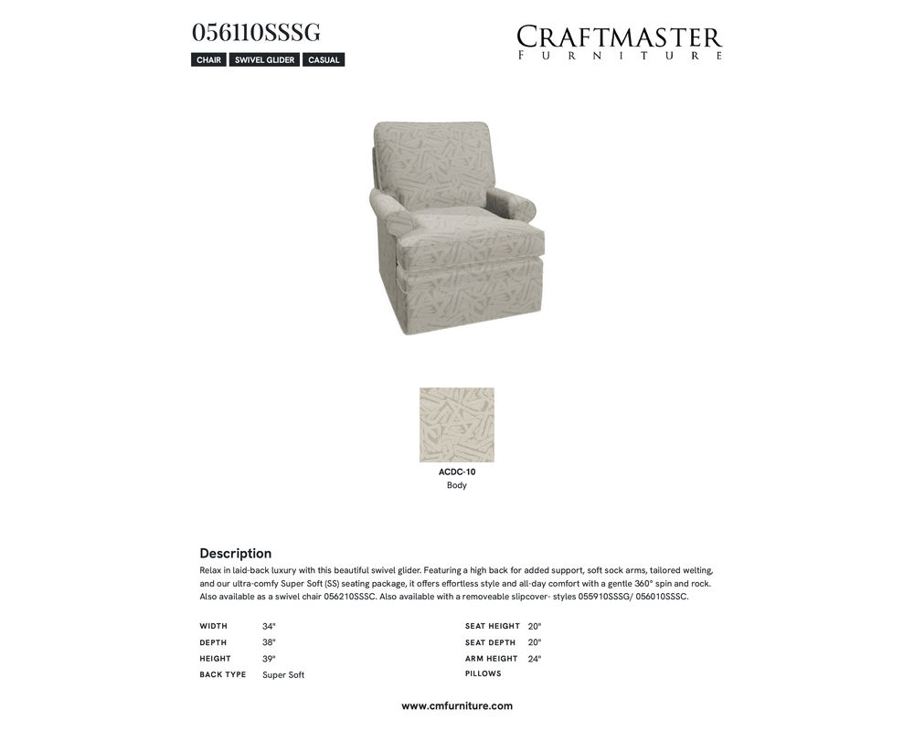 But that's not all - this swivel glider also features our ultra-comfy Super Soft (SS) seating package, ensuring all-day comfort and support. With a gentle 360° spin and rock, you can easily find the perfect position for ultimate relaxation.