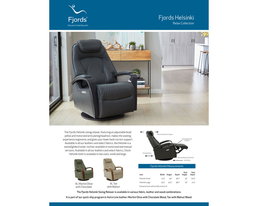 The Helsinki Swivel Glider Rocker Relaxer Recliner by Fjords represents the pinnacle of Scandinavian comfort engineering and refined design. Crafted to deliver exceptional ergonomic support, the Helsinki provides targeted lower-back comfort and a perfectly balanced seating experience. Includes both power recline and power headrest functions add effortless convenience for everyday relaxation.