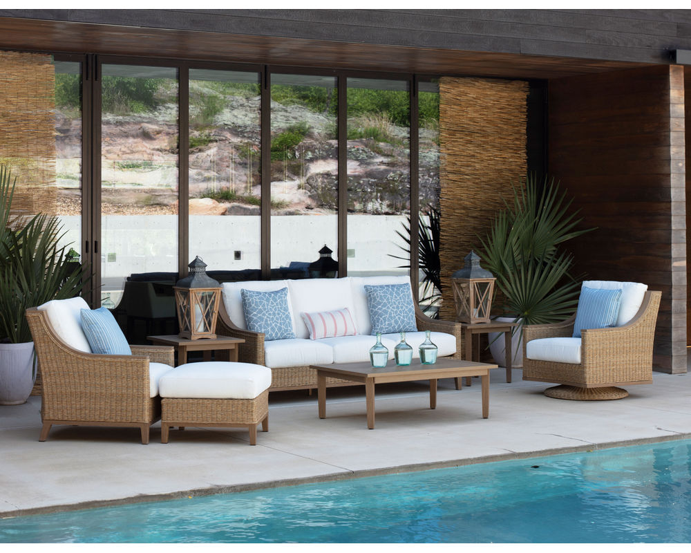Enjoy the style and comfort of the Hemingway Loggia Outdoor Swivel Chair. Hand-Woven Synthetic wicker weave over premium power-coated aluminum with cast aluminum legs. Available in all LANE VENTURE stain and mildew resistant solution dyed fabrics.