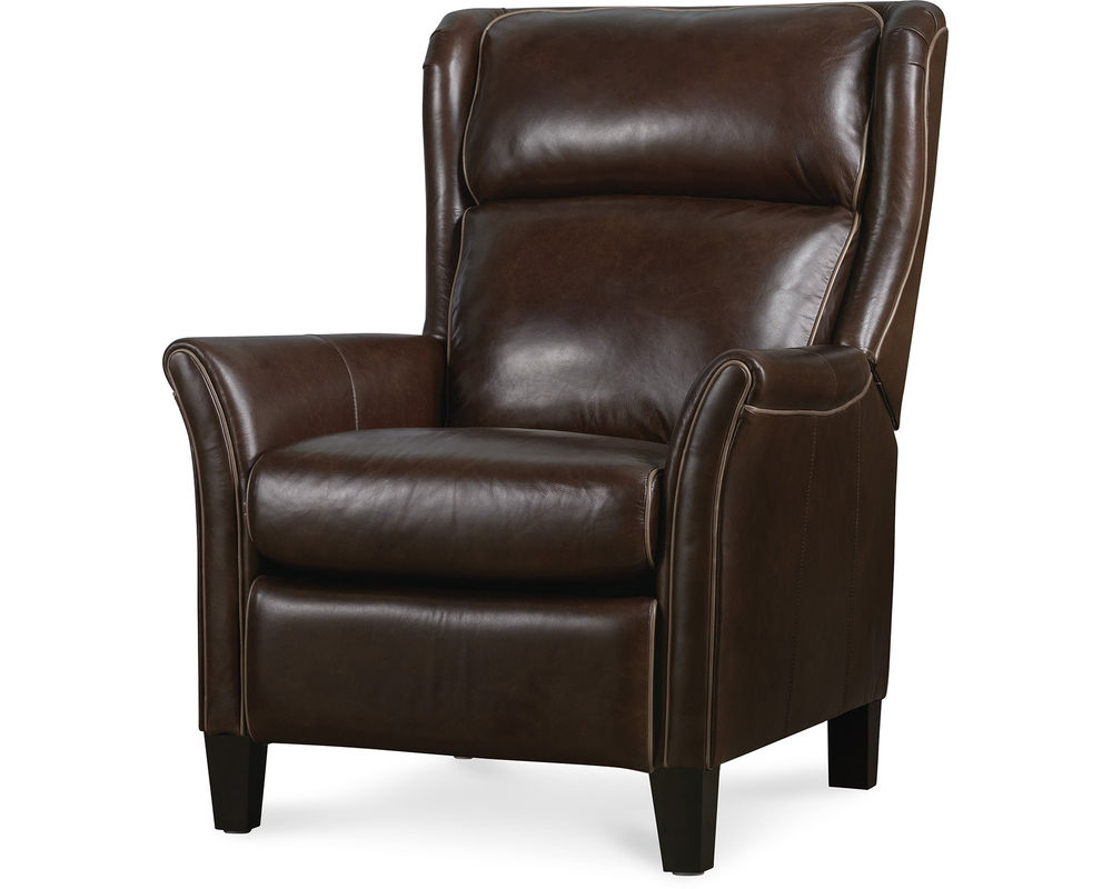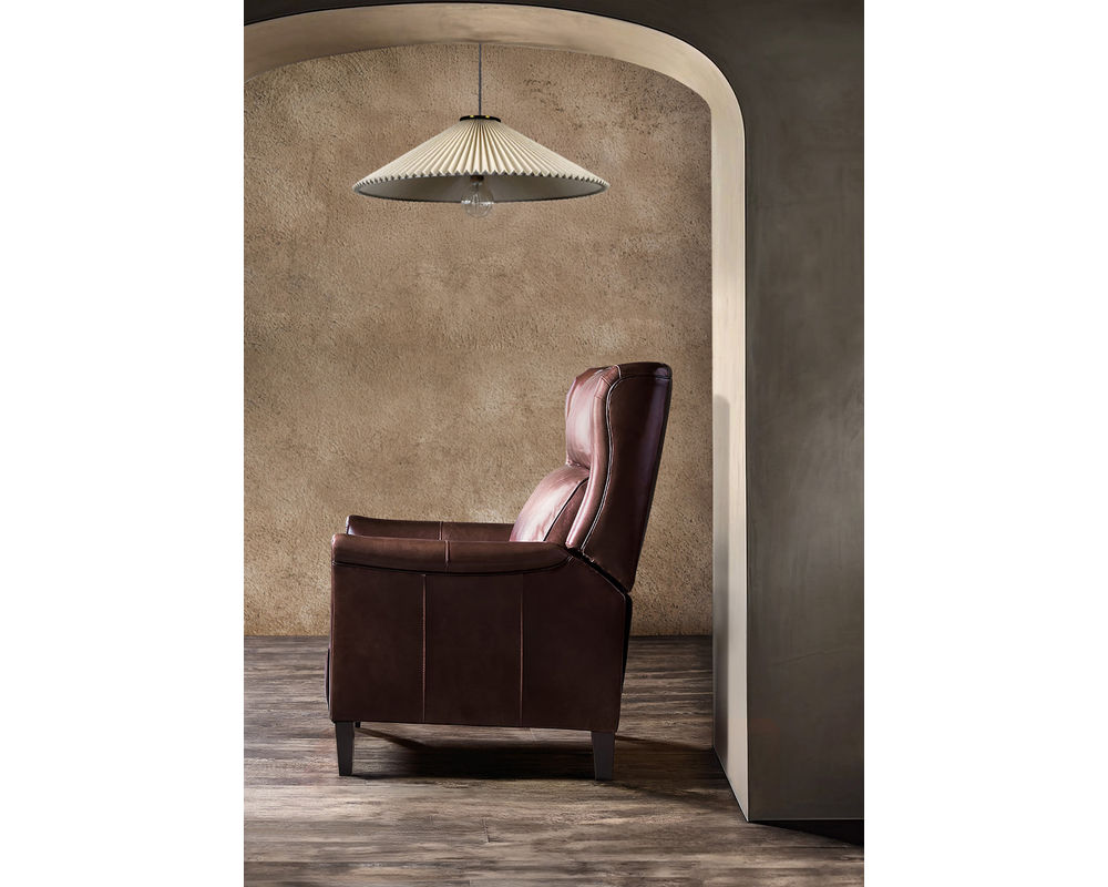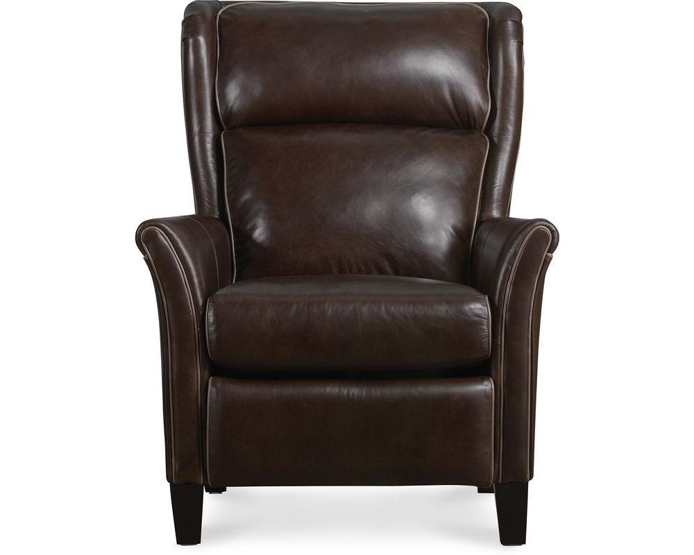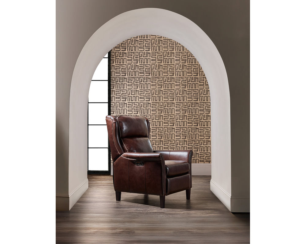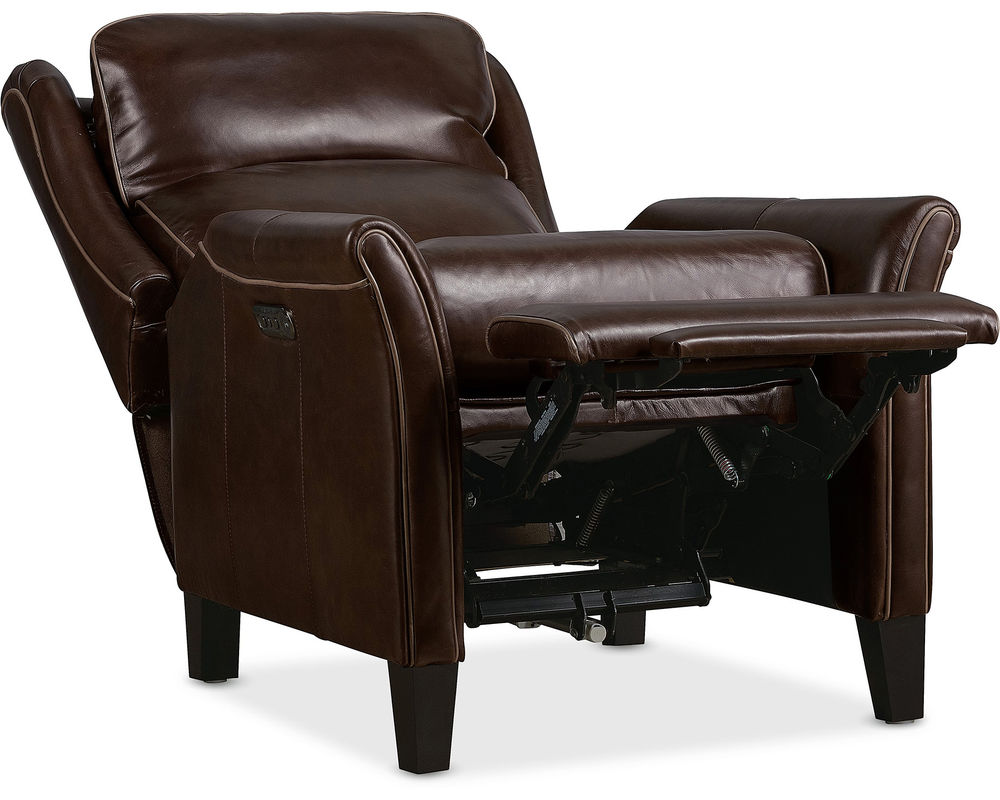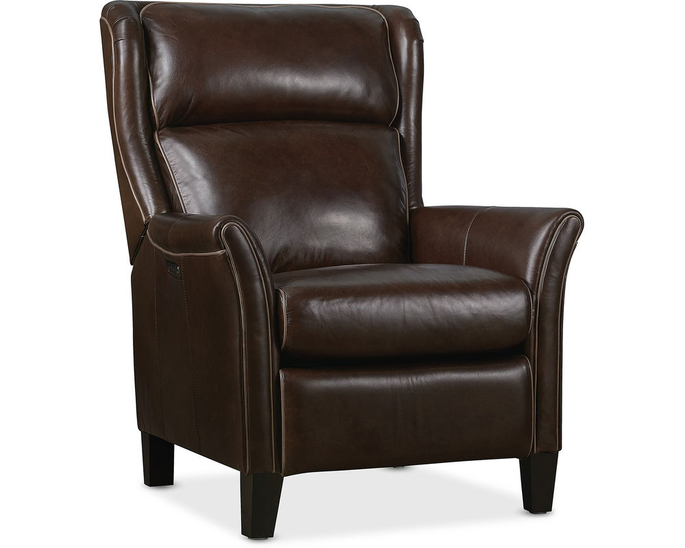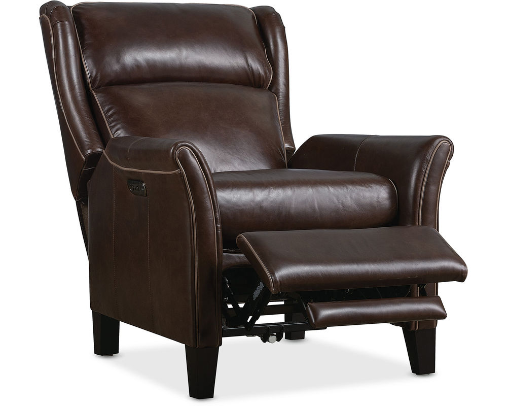 Classic Elegance Meets Modern Comfort Elevate your home with the Henley Power Recliner by Hooker Furniture—a refined fusion of traditional style and modern functionality. Upholstered in rich, top-grain aniline leather, the Henley boasts a sophisticated brown tone that brings warmth and character to any space. Its broad wingback silhouette, flared arms, and contrast welt detailing enhance its timeless appeal, while power reclining, a power headrest, and built-in USB port deliver contemporary convenience. Whether placed in a living room or reading nook, the Henley invites you to unwind in luxury.
