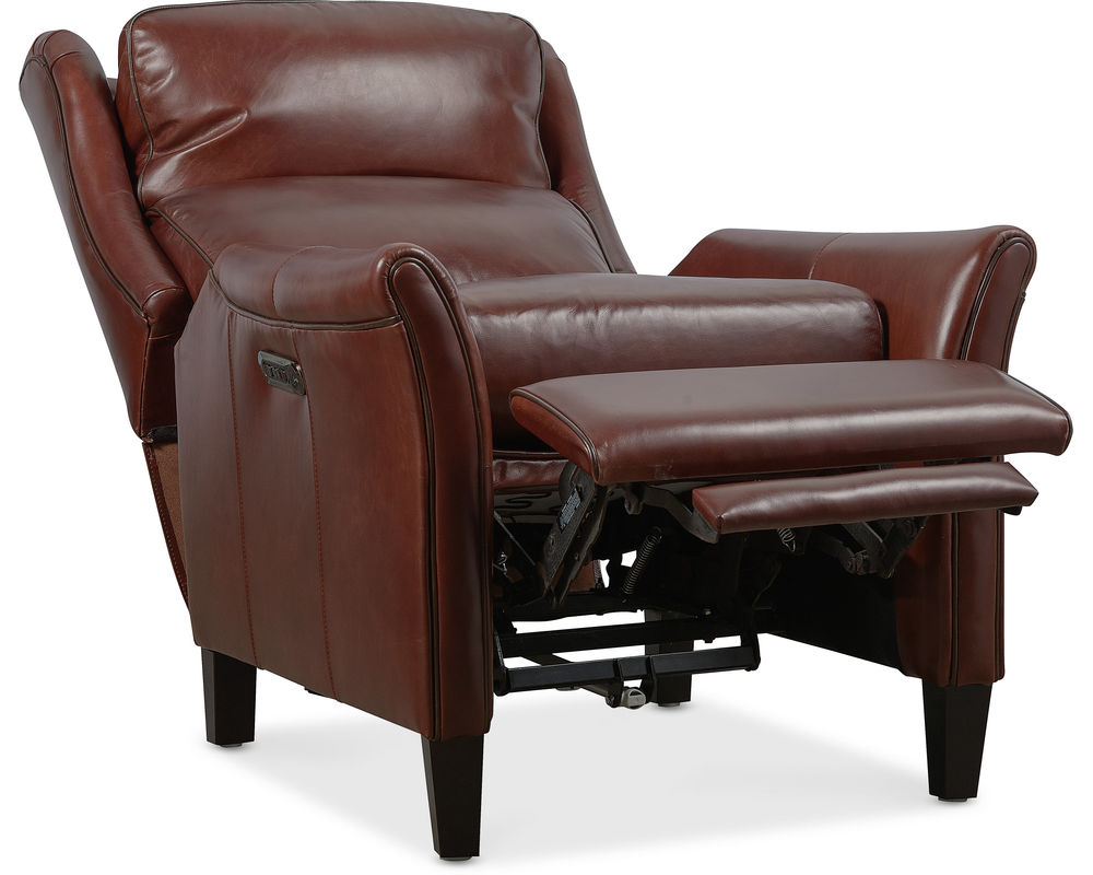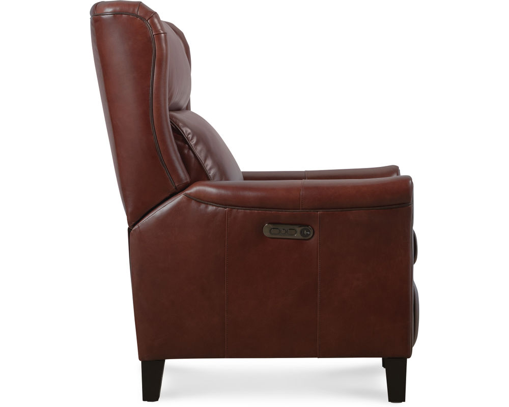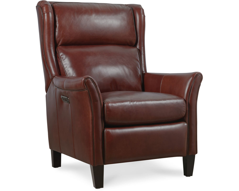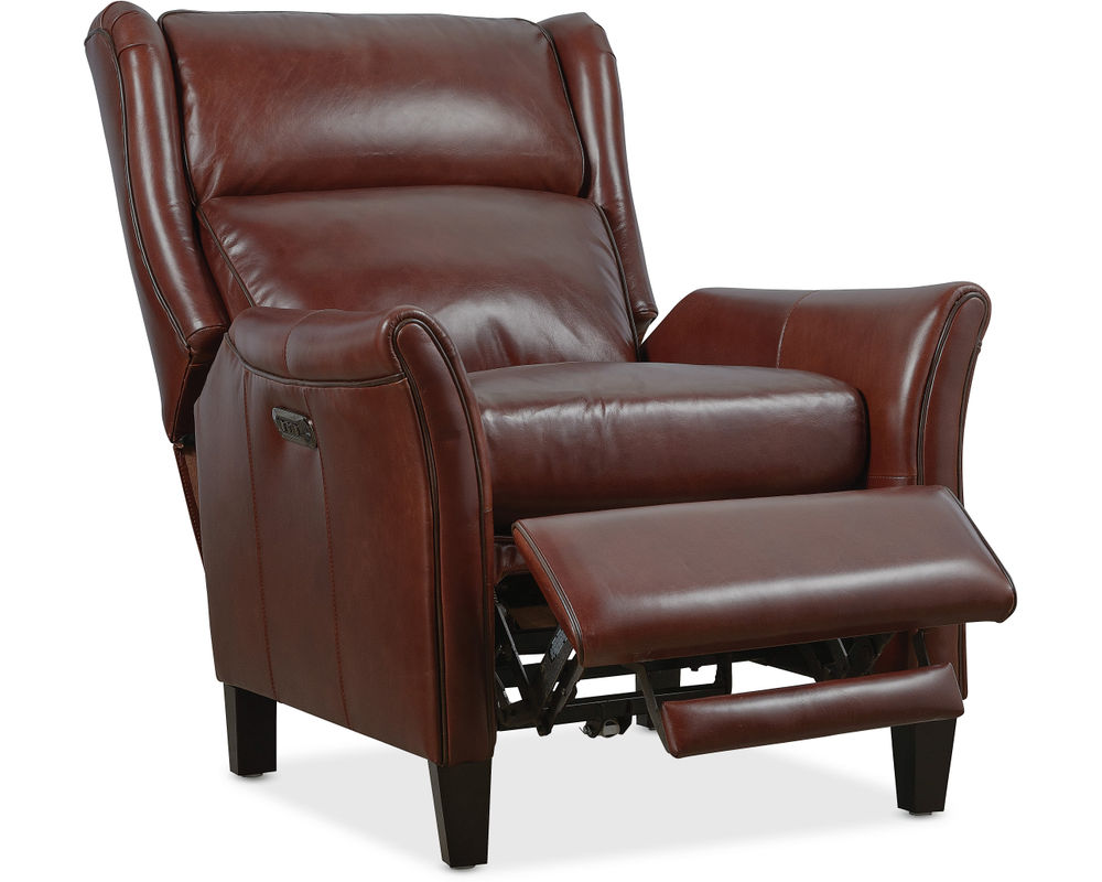 Classic Elegance Meets Modern Comfort Elevate your home with the Henley Power Recliner by Hooker Furniture—a refined fusion of traditional style and modern functionality. Upholstered in rich, top-grain aniline leather, the Henley boasts a sophisticated brown tone that brings warmth and character to any space. Its broad wingback silhouette, flared arms, and contrast welt detailing enhance its timeless appeal, while power reclining, a power headrest, and built-in USB port deliver contemporary convenience. Whether placed in a living room or reading nook, the Henley invites you to unwind in luxury.