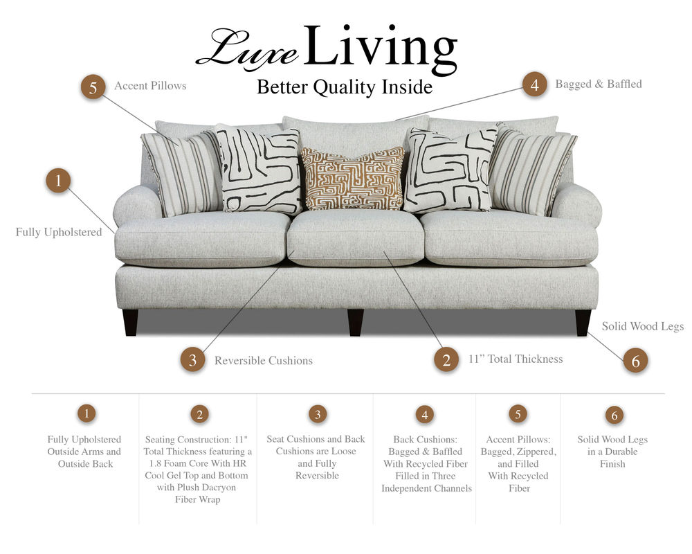 The Luxe Living Collection also features 11-inch-thick seat cushions that are zippered, loose, and reversible. This makes cleaning and maintaining the sofa easy and ensures it stays in pristine condition for years.
