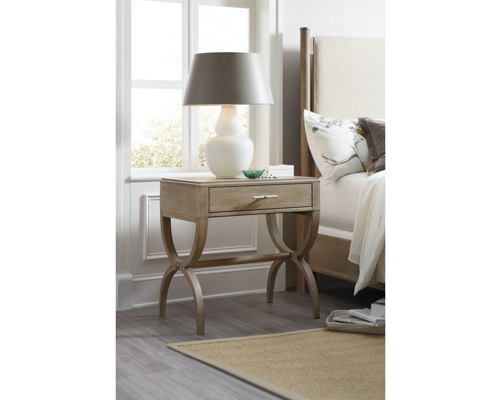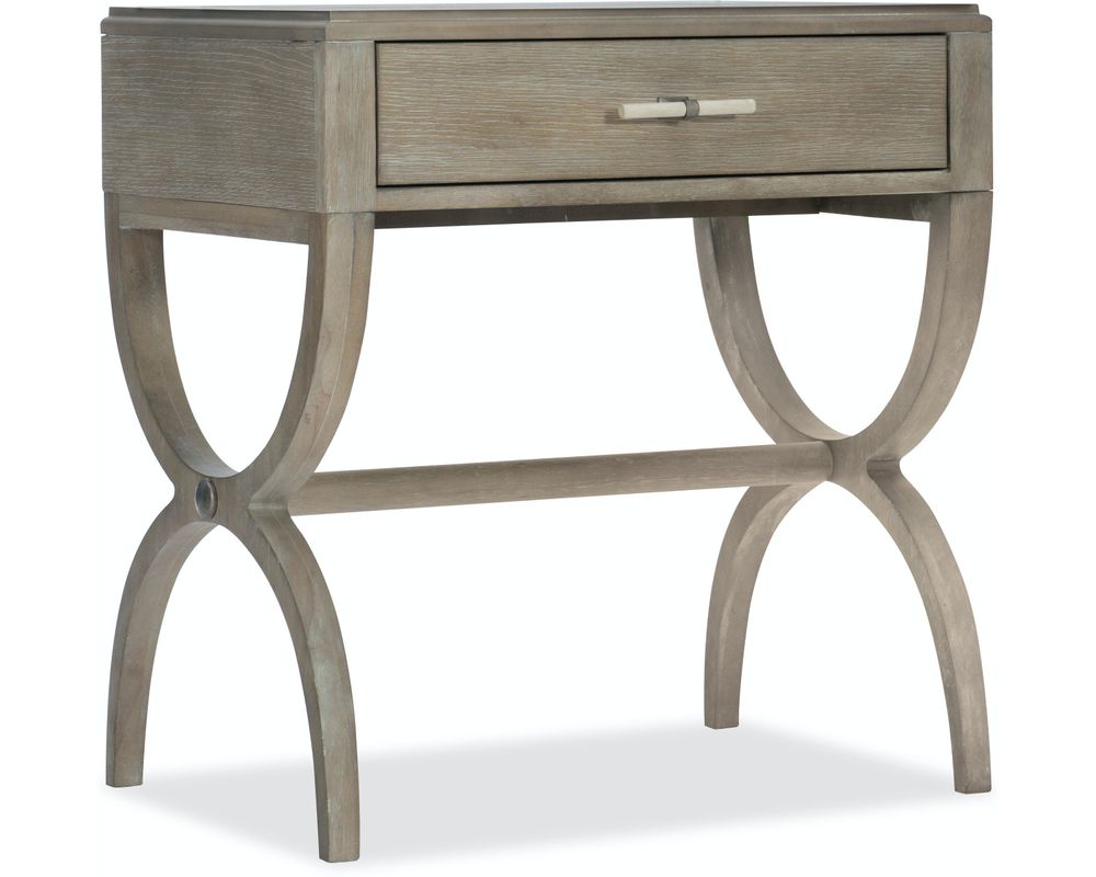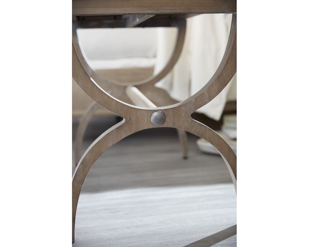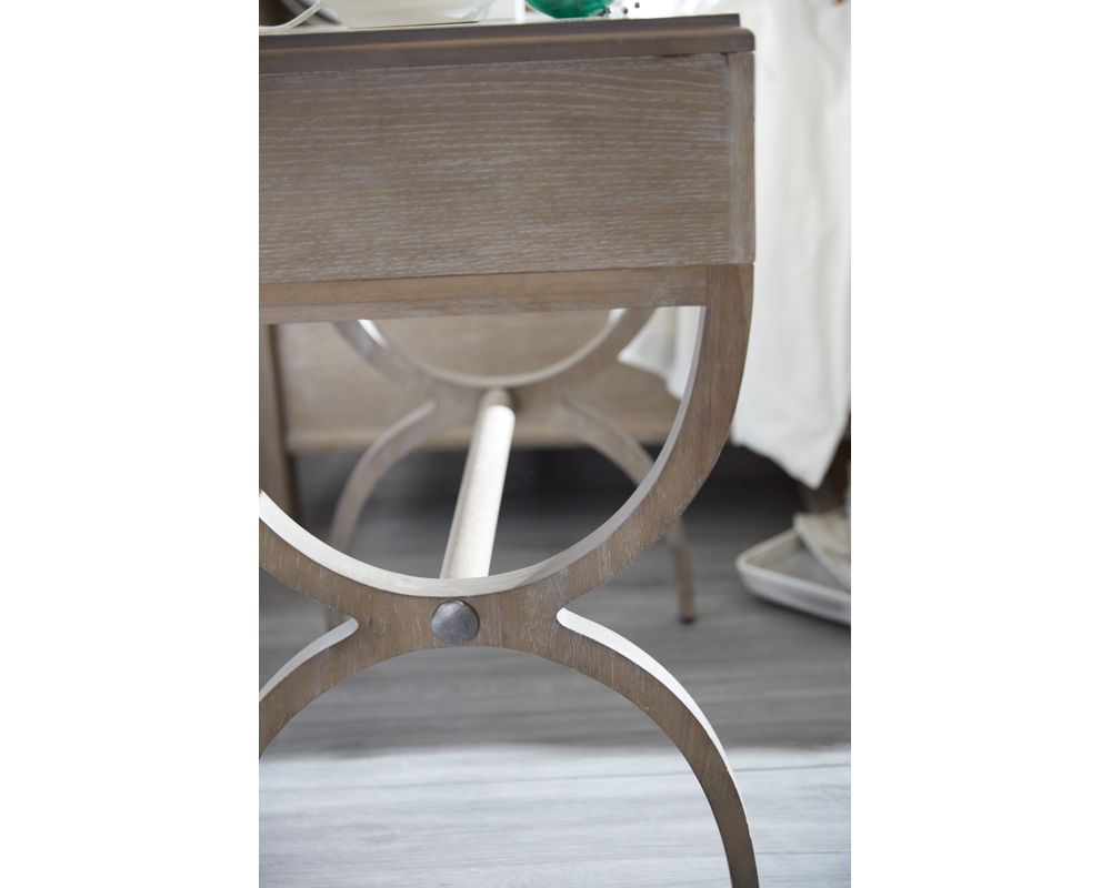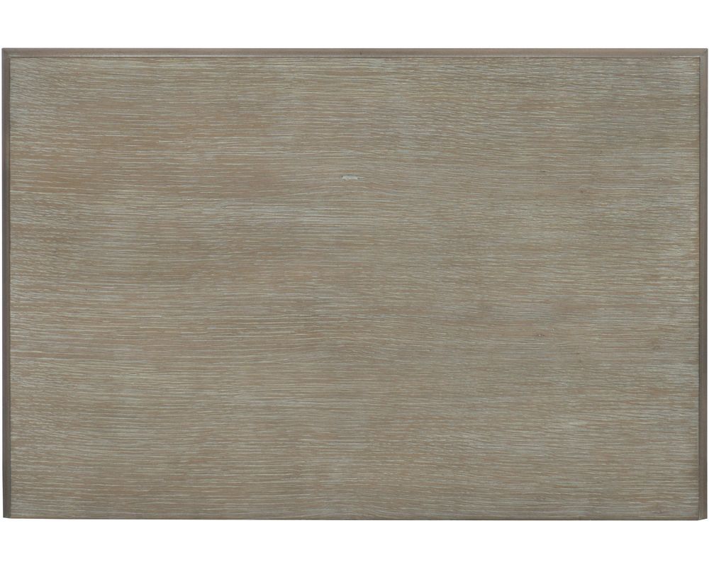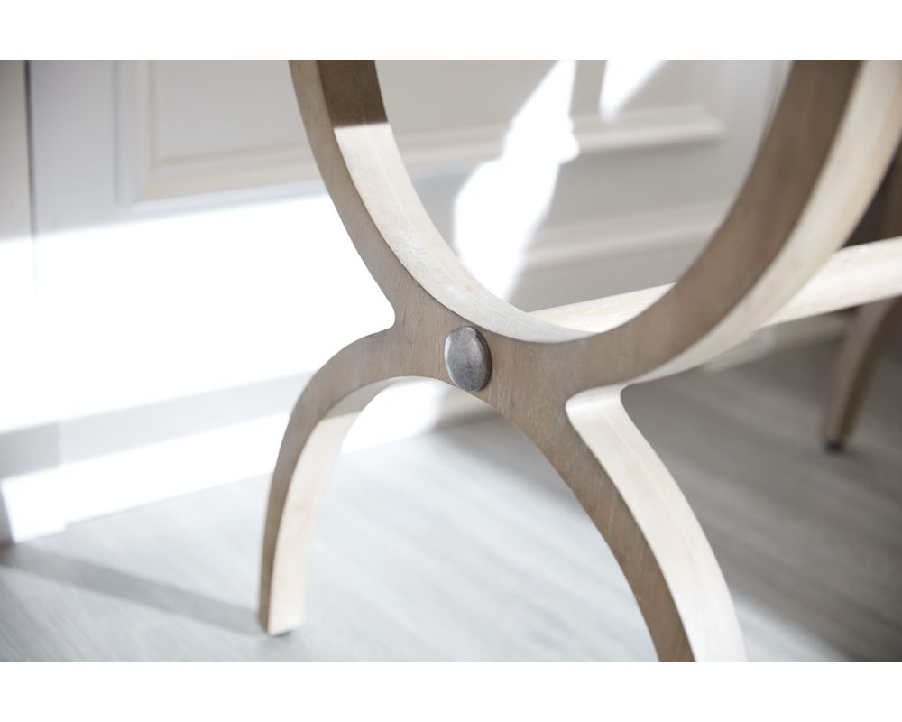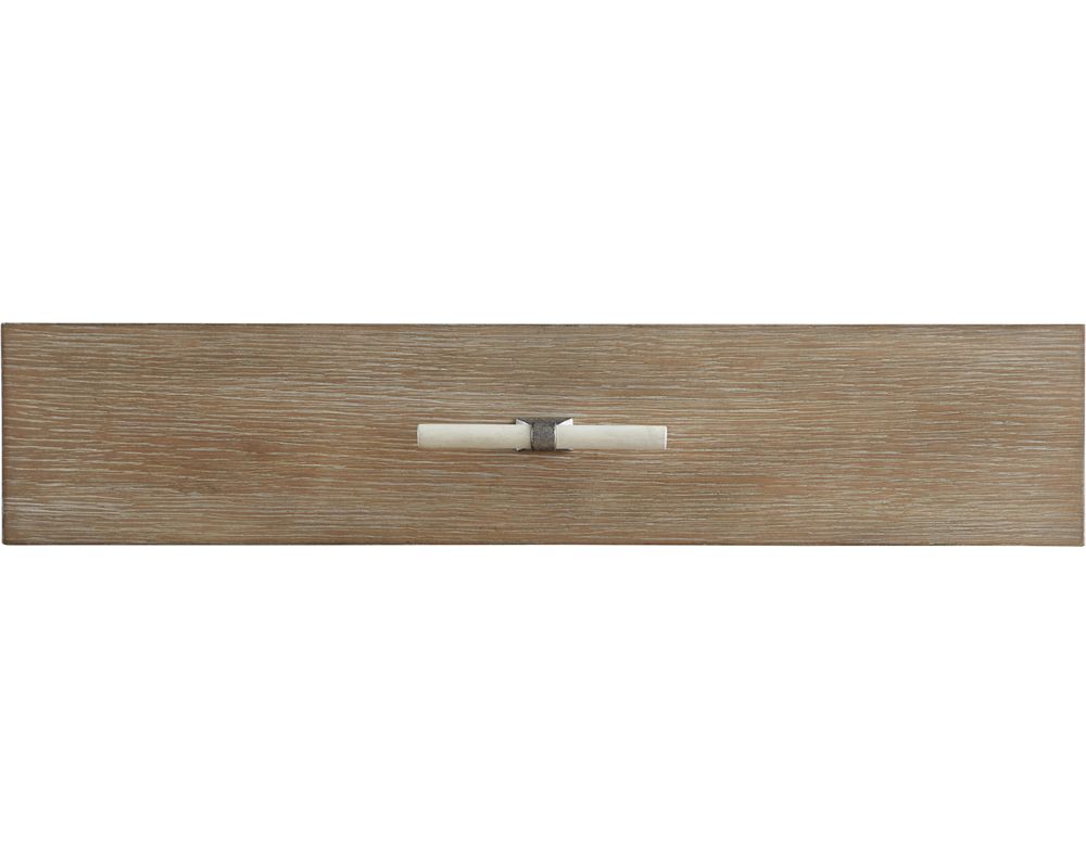 Soft, rounded forms combine with sand-blasted greige and antique white finishes to create an inviting transitional boutique collection in Affinity. The main finish for the 20-piece collection of bedroom, dining room, occasional, accents and home entertainment is a wire-brushed greige (gray/beige) on quartered white oak. Pewter and antique white hardware and soft linen fabrics add intrigue.