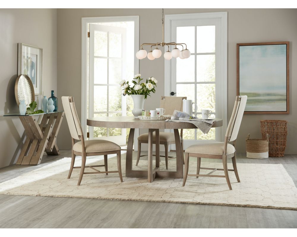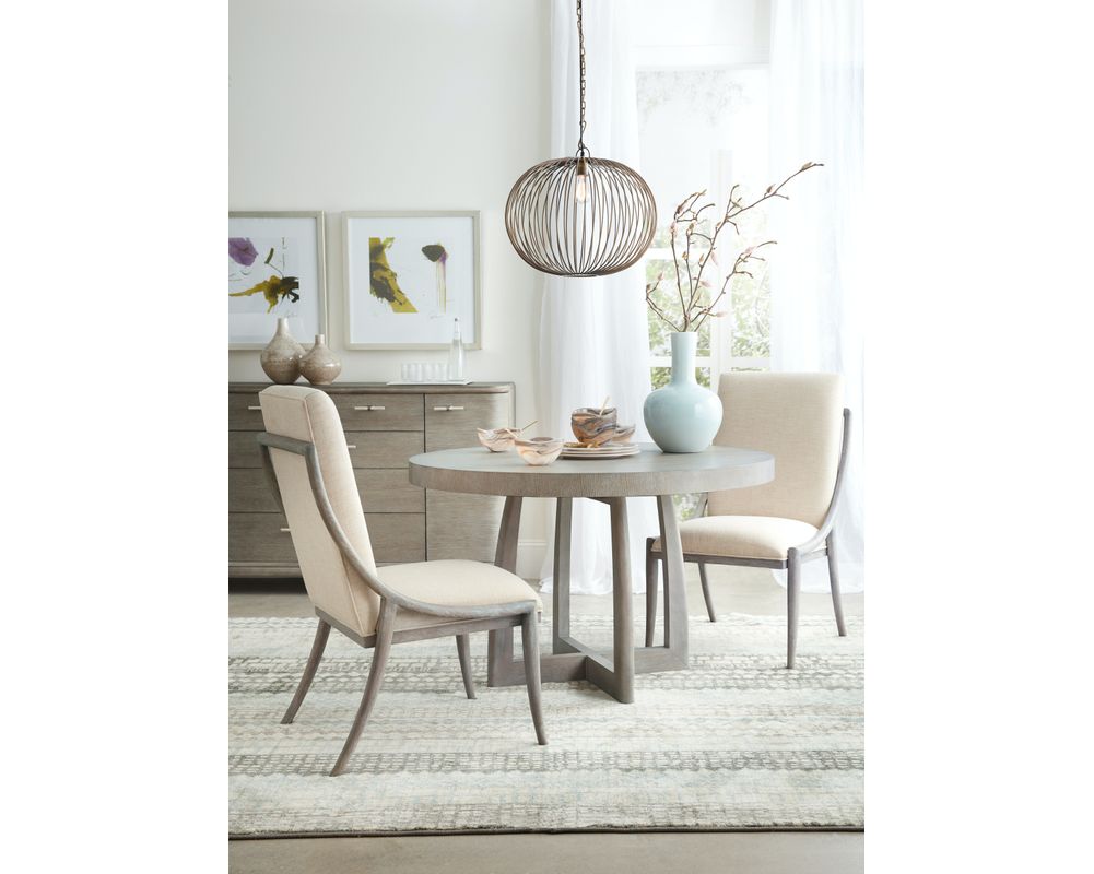 Soft, rounded forms combine with sand-blasted greige and antique white finishes to create an inviting transitional boutique collection in Affinity. The main finish for the 20-piece collection of bedroom, dining room, occasional, accents and home entertainment is a wire-brushed greige (gray/beige) on quartered white oak. Pewter and antique white hardware and soft linen fabrics add intrigue.