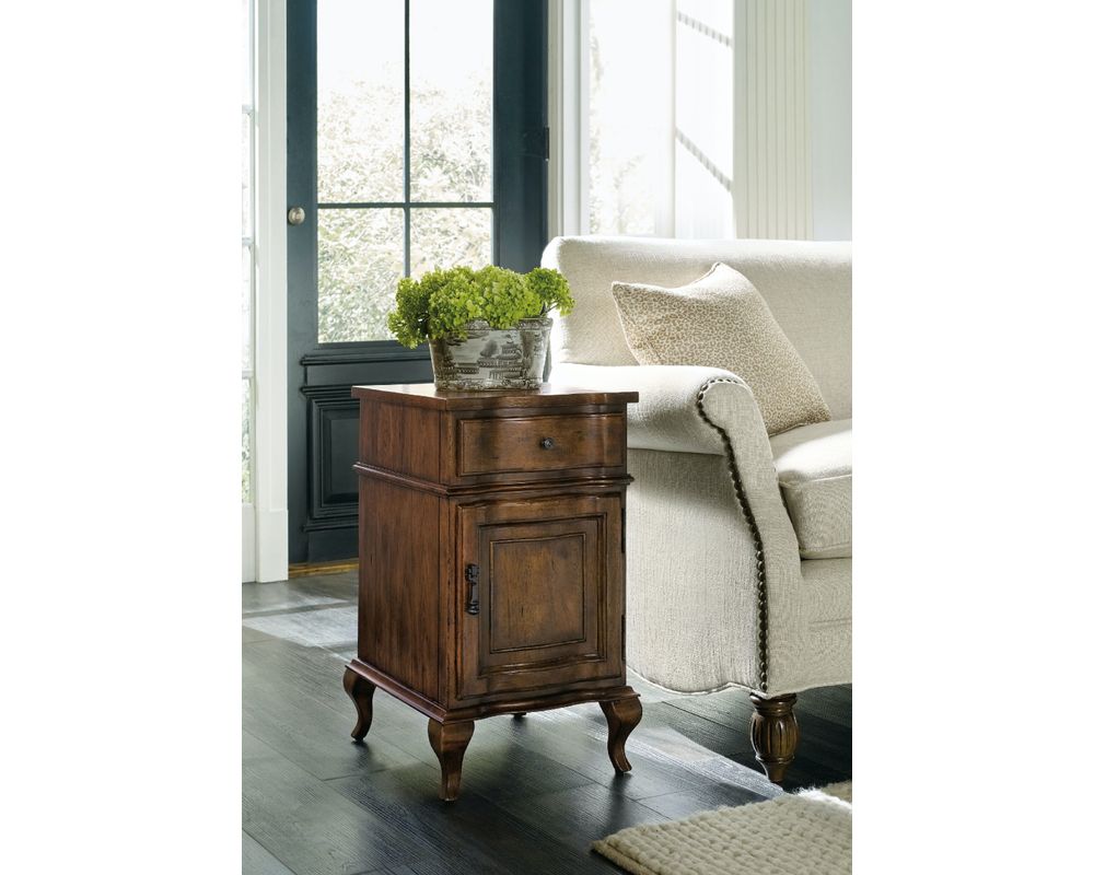 Create an inviting atmosphere with the Archivist Accent Chairside Chest. From the shapely cabriole legs to the soft casual Pecan finish to the tear-drop shaped pendant hardware in a time-worn bronze color, the chairside chest is inspired by authentic French antiques. As practical as it is pretty, the chest offers handy storage in a compact footprint with one door with an adjustable wood shelf behind and one drawer. A design archive that captures epic European and American style elements spanning continents and centuries, Archivist exudes a larger-than-life ambience. With a world-traveled pedigree, Archivist embraces both grand opulence and beloved, comfortable and simple forms.