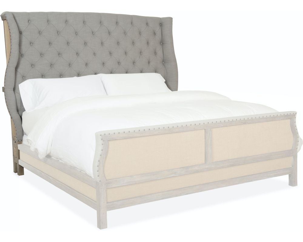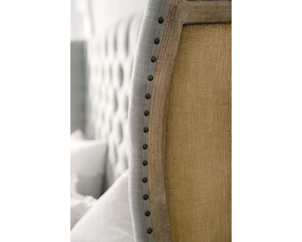 Inspired by the Belgian design aesthetic, the Bon Vivant De-Constructed Queen Bed combines a button tufted soft gray linen upholstered shelter headboard with a footboard, back and sides that pair linen and burlap for a sophisticated rustic appeal. The finish is Antique Milk paint, a light brown with a nearly opaque antique milk color and a brush-painted effect. Bed includes headboard, footboard and rails. Inspired by the Belgian design aesthetic, Boheme expresses the elegance of simplicity and the essence of comfort. Lyrical and intentional, Boheme offers a subtle array of three antique gray-white finishes, speaking to Belgium's penchant for all things gray. A neutral palette of gray, blue, white and soft brown blends lyrically with an array of textures and shapes to create Bohme. The poetic beauty of each piece is unveiled in Bohme through texture, color, piece character and artistic shapes.