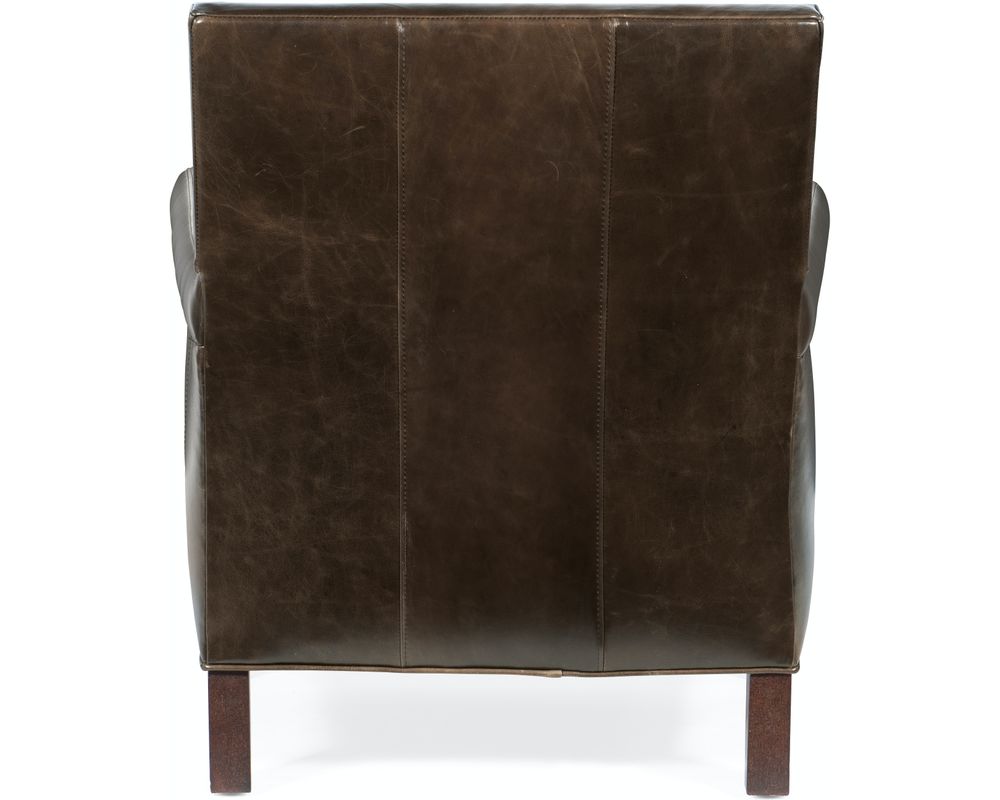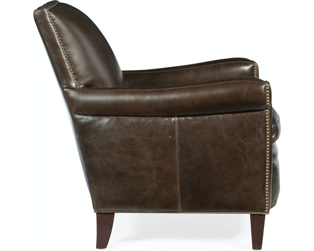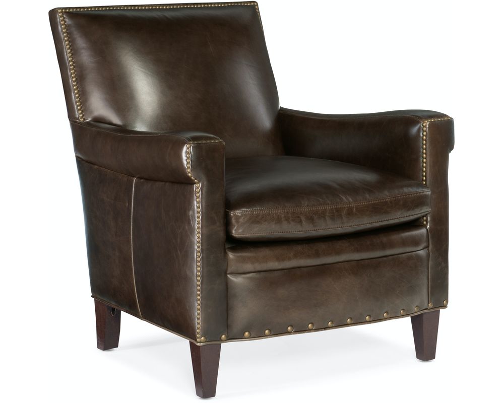 Sink into effortless elegance with the Jilian Club Chair from Hooker Furniture. Wrapped in luxurious Huntington Collis aniline top-grain leather, this chair offers classic club styling elevated by premium materials and handcrafted details. A generously plush seat and supportive high back invite hours of relaxed lounging, while the hand-applied brass nailhead trim and tapered wood legs in a rich Natchez finish complete the sophisticated look. Ideal for study, living room, or refined lounge settings.