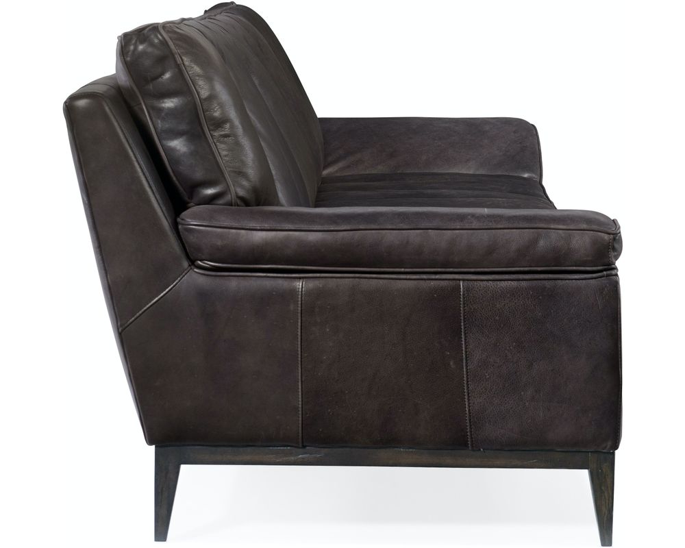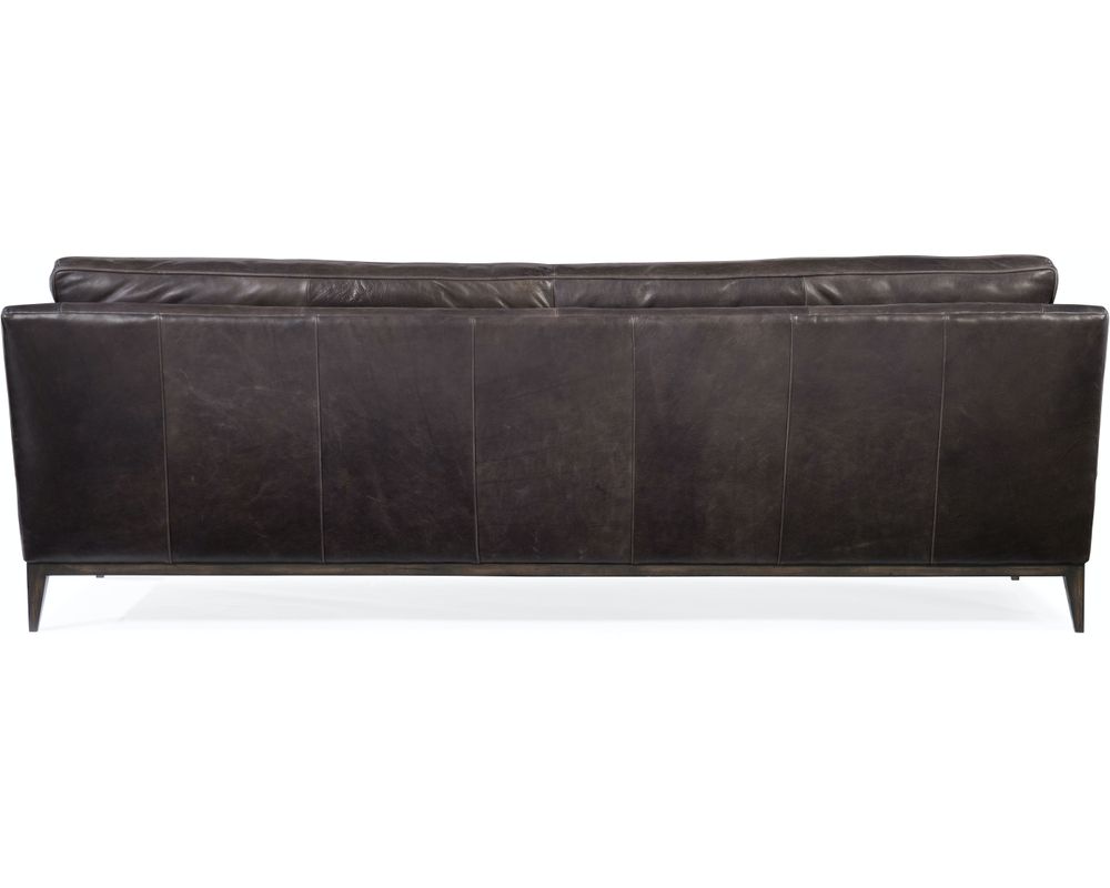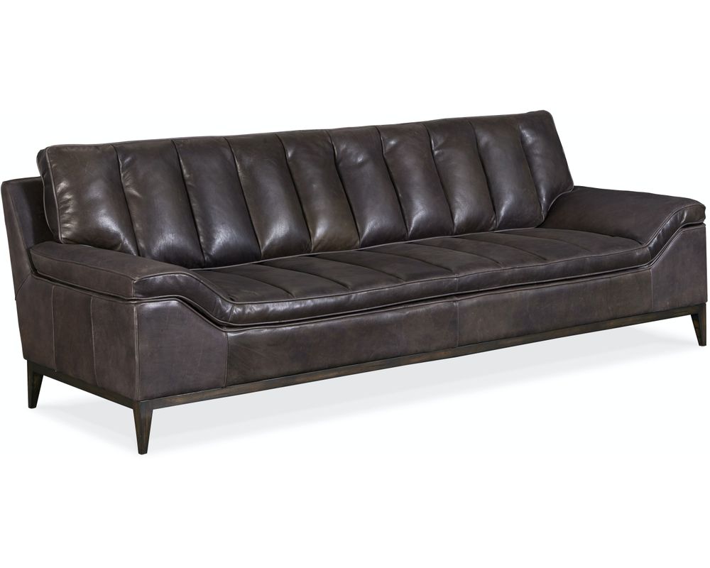 Make a bold statement in your living space with the Kandor Leather Sofa from Hooker Furniture. At 100 inches wide, this sleek and expansive piece features vertical channeling across the seat and back for a tailored yet plush look. The striking angular arms and raised silhouette create a floating effect, while the Debonair Graphite aniline top-grain leather upholstery delivers unmatched sophistication. Resting on dark wood legs, this sofa is designed to command attention while inviting you to sink in and relax.