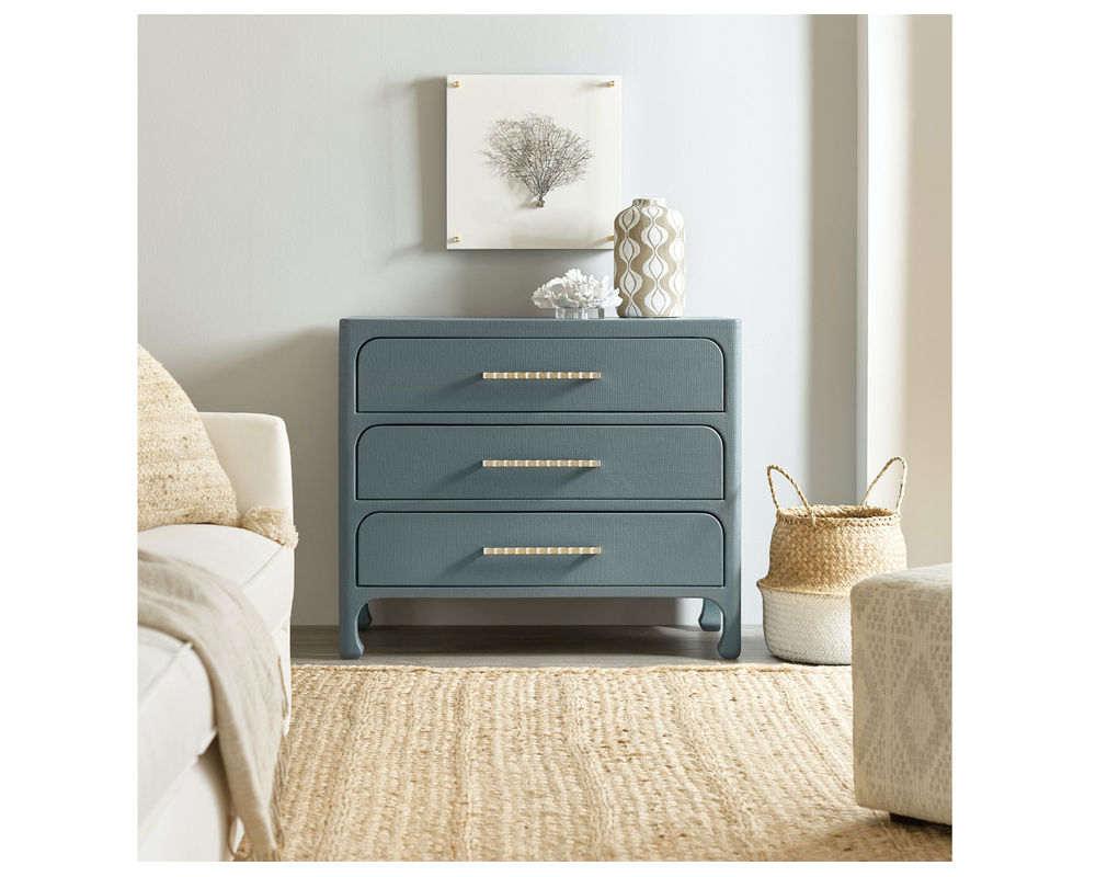 Designed to create a comfortable and inviting retreat within the home, the Serenity collection is defined by its casual finishes and variety of organic textures and materials that combine to deliver a relaxed aesthetic. Inspired by casual, waterfront living, the collection was designed to bring the relaxed aura of the outside in -- no matter where the consumer lives. White oak veneer delivers two key finishes – a whitewashed look and a weathered gray – and is accented with shades of soft coastal blue, sand blasted pine and soft white bronze metal details. Organic materials including abaca rope, natural stone, painted grass cloth, louvered details, and faux coral motifs add to its casual style. The collection’s silhouettes were designed to reflect three distinct personalities – a traditional nature with serpentine shaped case pieces and a softer aesthetic, a modern persona with linear shapes and coral accents, as well as a more casual contemporary character with soft-edged case pieces and organic surfaces.