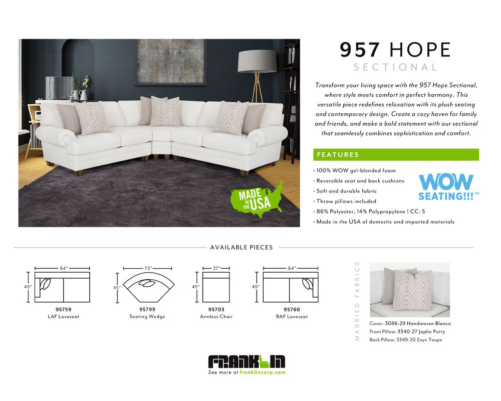 Introducing the 957 Hope Sectional by Sofas and Sectionals - a versatile piece that strikes the perfect balance between style and comfort. With its plush seating and contemporary design, this sectional redefines relaxation, making it a must-have for any modern home. Its unique selling points include a perfect balance of style and comfort, making it a versatile piece for any modern home.