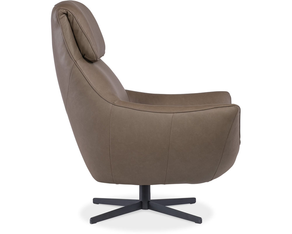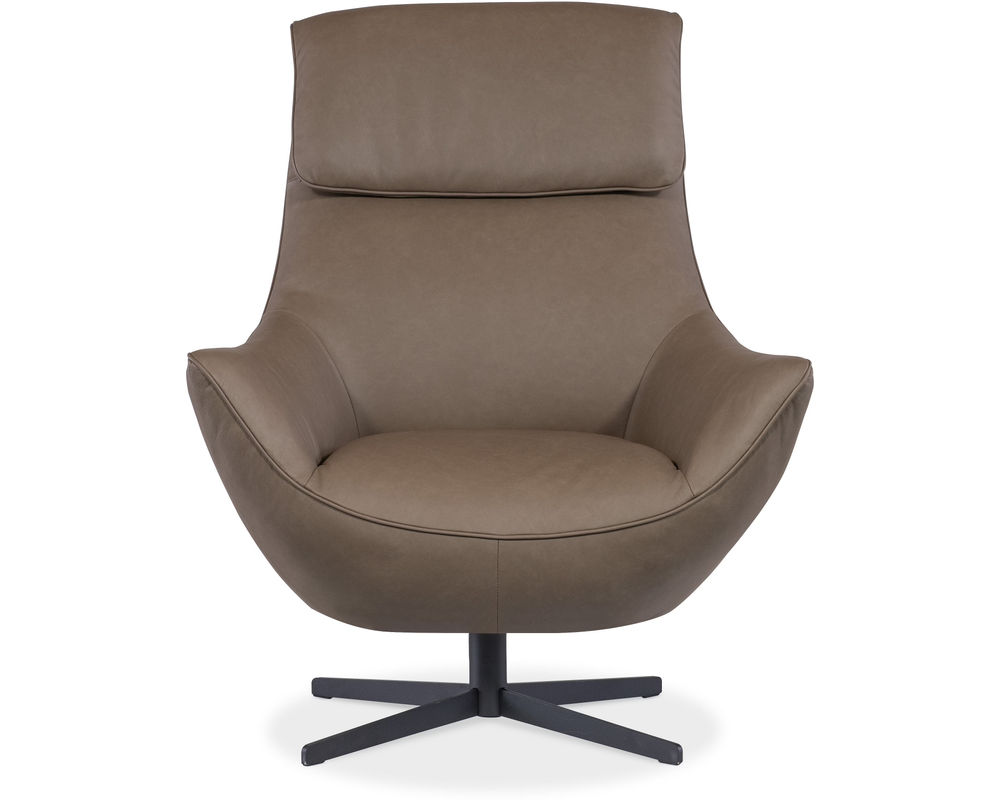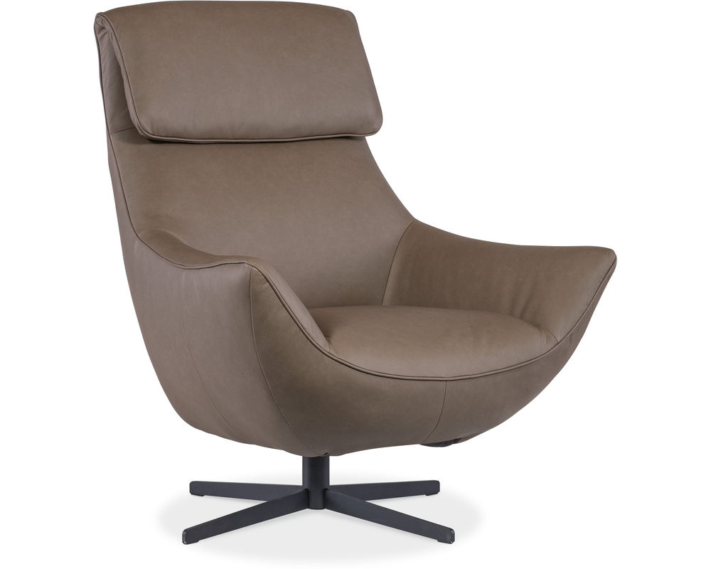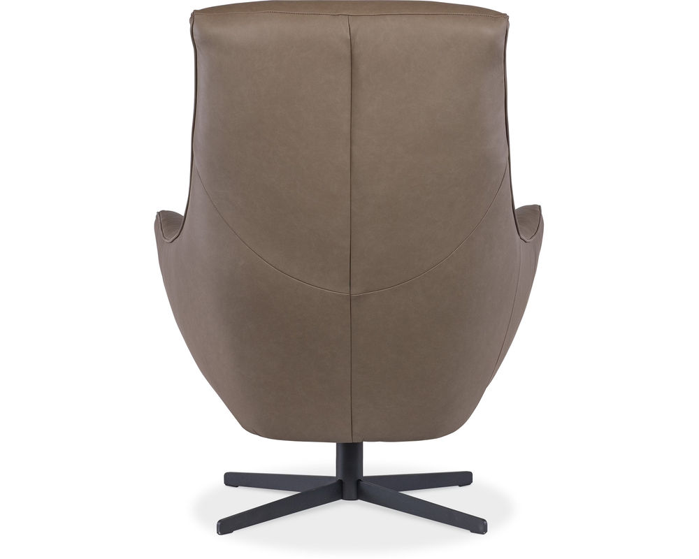 Sculptural Style Meets Seamless Comfort Make a modern statement with the Hughes Swivel Chair from Hooker Furniture. Featuring a sleek, sculpted silhouette and gently flared arms, the Hughes blends contemporary design with everyday comfort. Upholstered in soft, top-grain leather and supported by a minimalist black metal swivel base, this chair offers smooth mobility and eye-catching appeal. Whether in a stylish living room or sophisticated office, the Hughes is your go-to for elevated lounging.