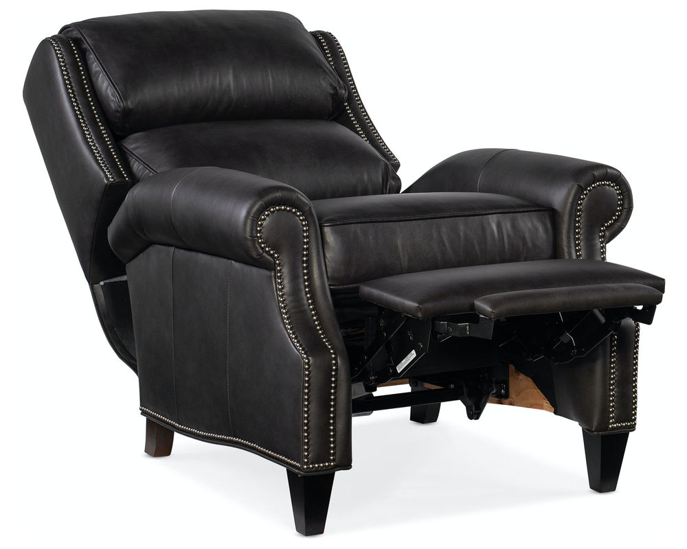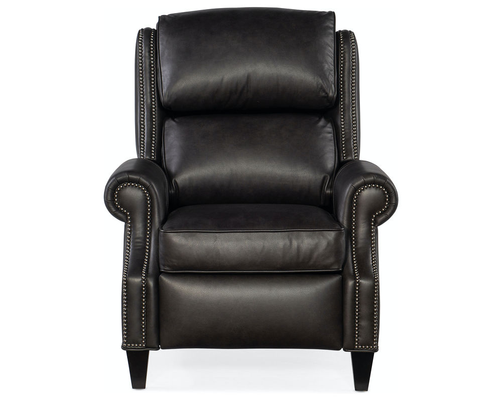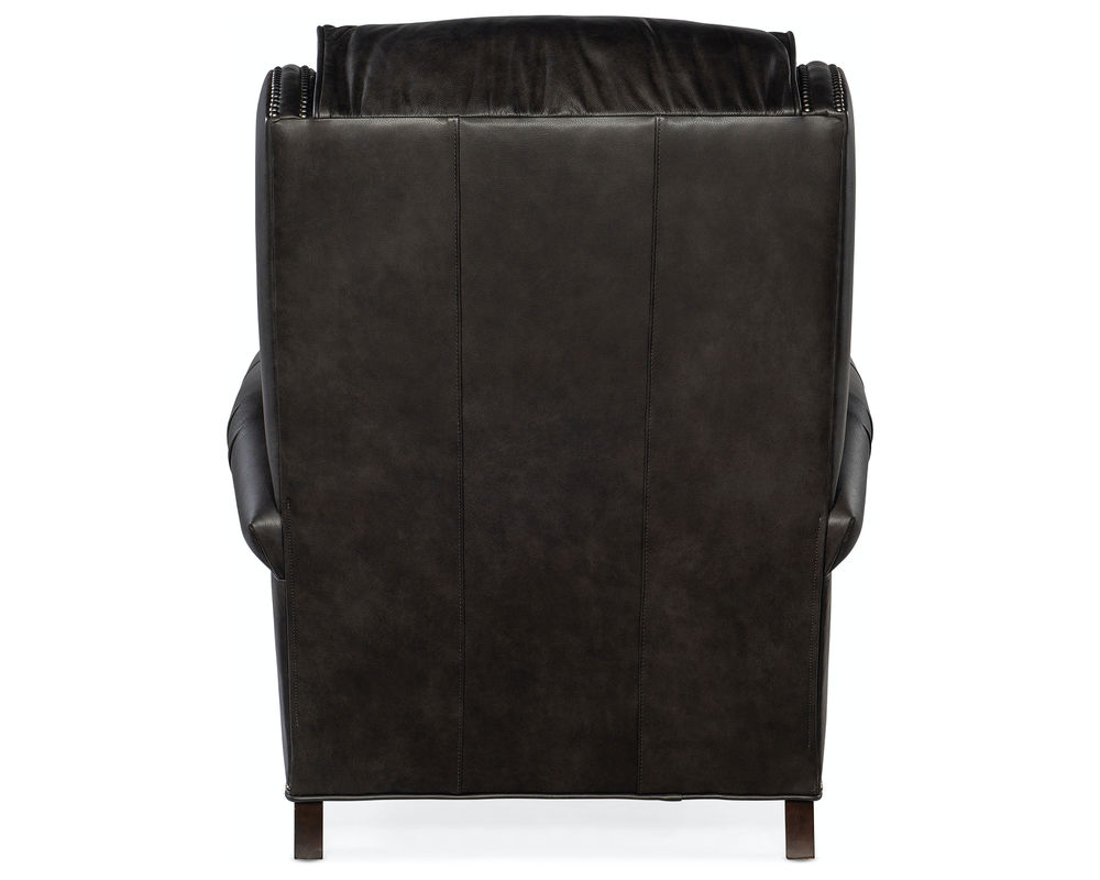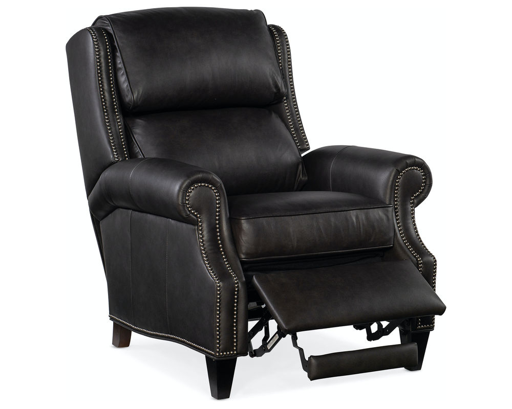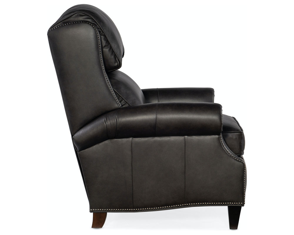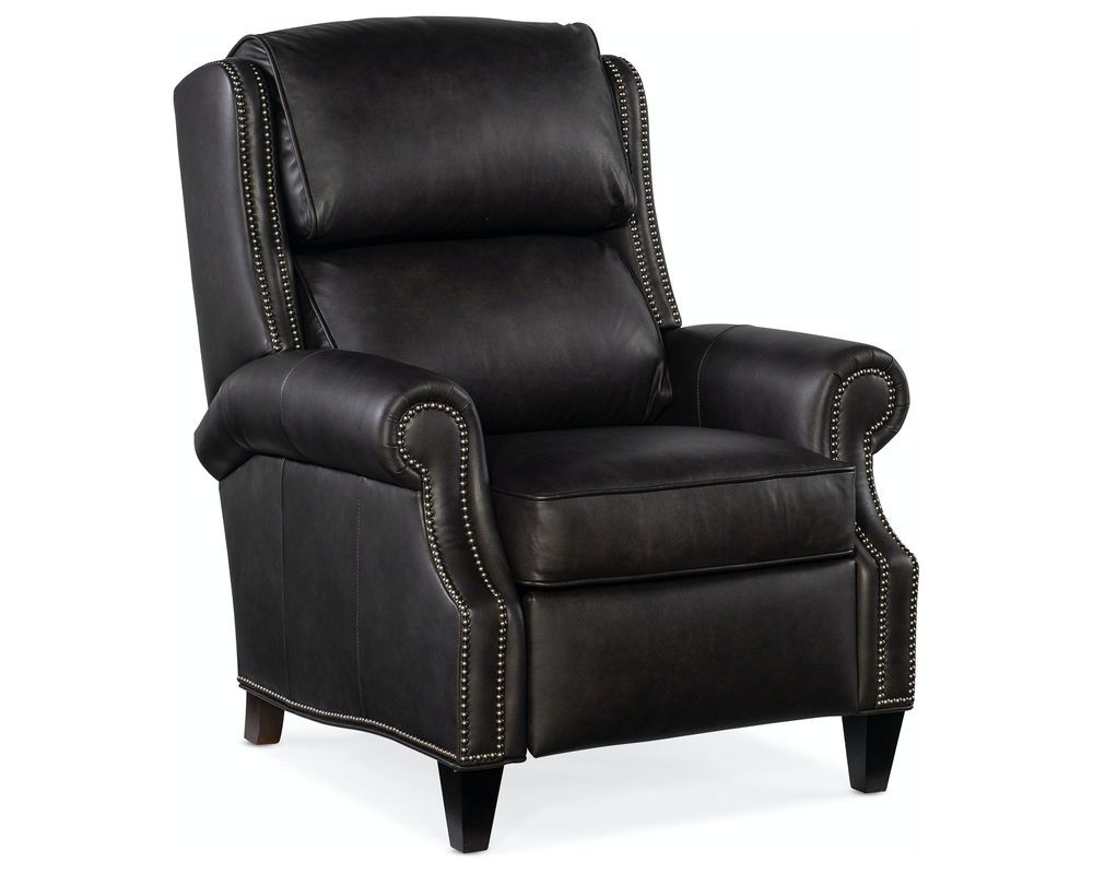 The Huss Reclining Chair comes standard with Mahogany finish and #9 Natural Brass nails. . This chair features a semi-attached back and HR Foam seating. Power recline option is available at an up-charge. There is something irresistible about a plush recliner that often makes it the most desired seat in the house. After all, who doesn’t enjoy the indulgence of lounging like a king or queen at the end of a long day? Emanating in luxury – and proving that comfort and sophisticated design can co-exist – our recliners guarantee long hours of relaxation without having to forgo style. With a wide variety of recliners available, it’s easy to express your personal style while achieving your “royal-status.” Hand-crafted with the highest quality reclining mechanisms available today for a deeply luxurious ride, all you’ll have to worry about is who gets control of the remote. Finished charcoal leather.