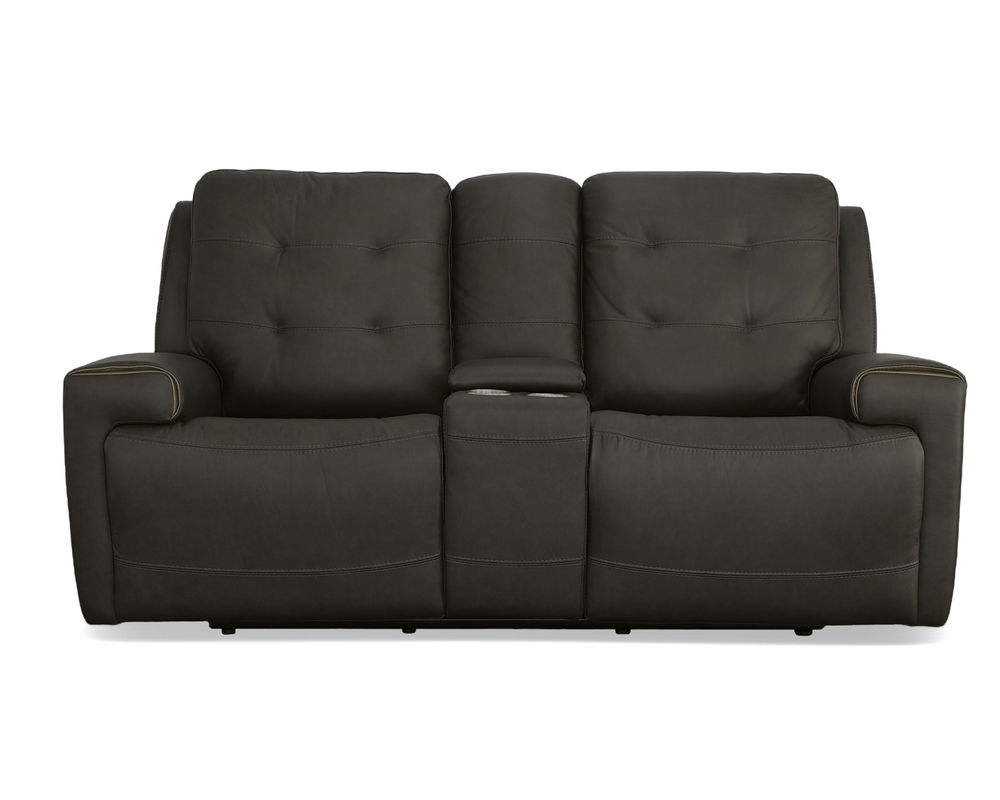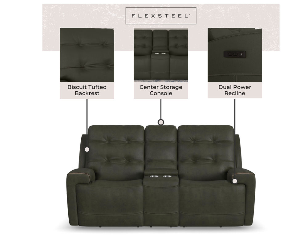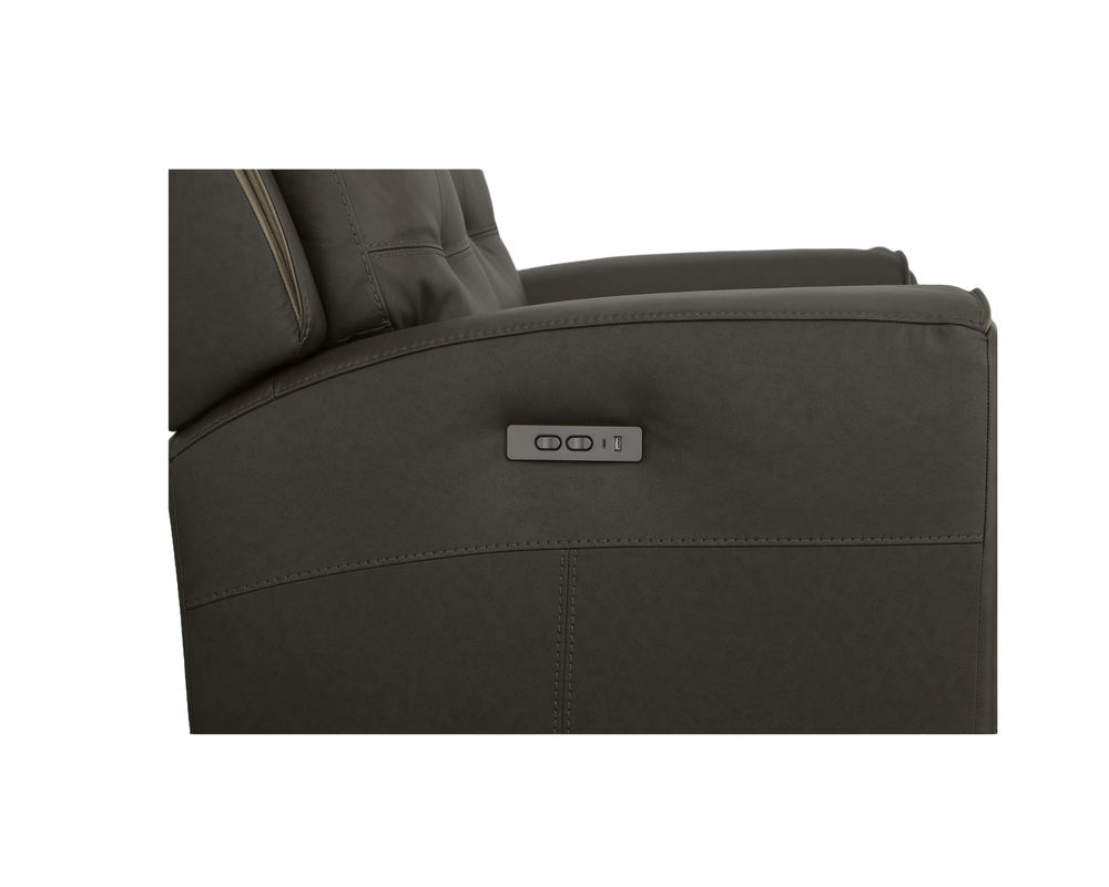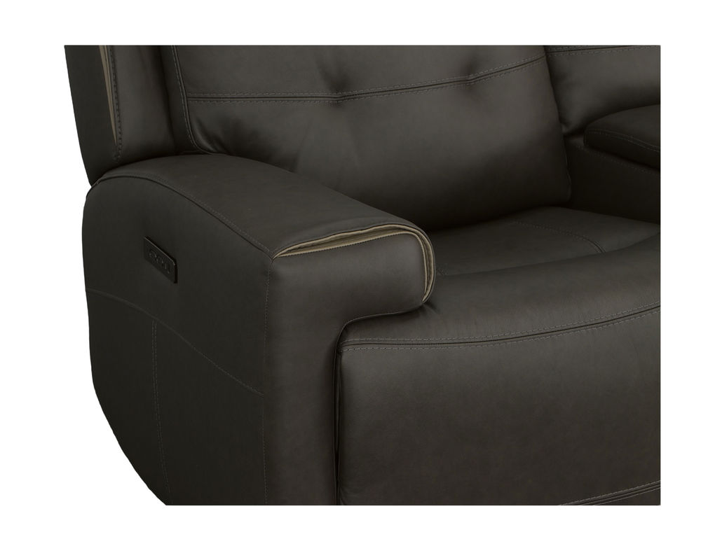 The Flexsteel Iris1781 Power Reclining Console Loveseat offers adjustable comfort and stylish details that make it stand out from the rest. This loveseat features dual power recline mechanisms, adjustable headrests, Zero Gravity technology, and waterfall chaise footrests for maximum comfort and relaxation. The high-quality upholstery consists of top-grain leather in two color choices for enhanced beauty and durability. The loveseat also includes eye-catching details such as top-stitched French seams, biscuit tufting on the back, and contrast color-wrapped seams along the thin pad arms and recessed wings. For added convenience, the loveseat also has USB ports for your mobile devices and a center storage console to keep drinks and remotes within easy reach. Make the Flexsteel Iris1781 Power Reclining Console Loveseat the perfect addition to your home and experience the difference that thoughtful details make.