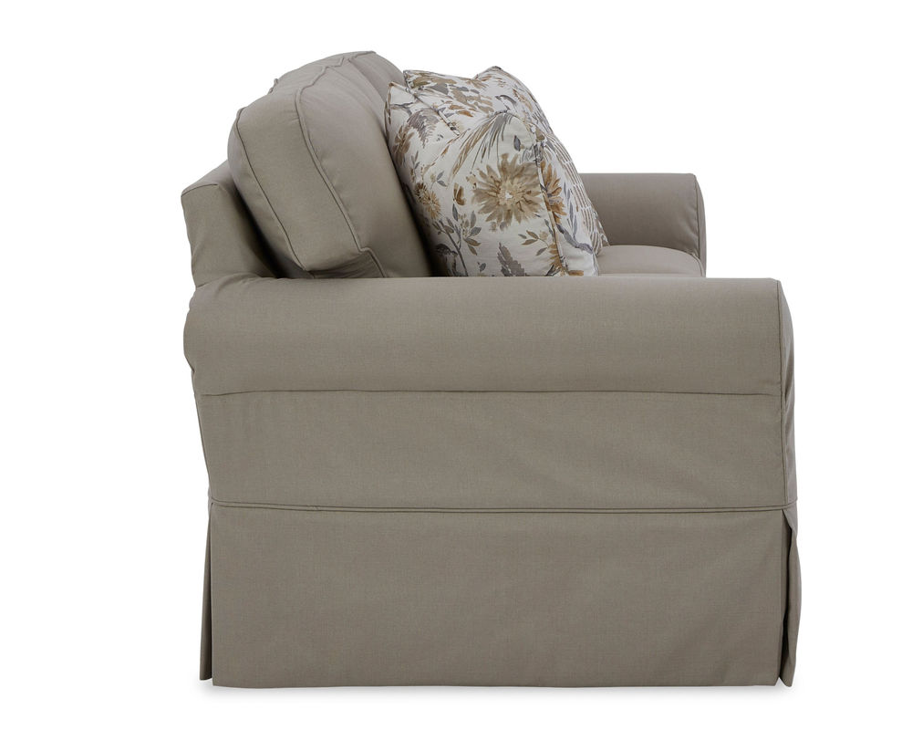 This classic James 9174 Slipcover Sofa is classic and modern, blending traditional style with today's trends. It features a true, removable slipcover that fits snugly, with Velcro attachments in key areas. It can be ordered in any of our fabrics, including a few that are machine washable. The sofa offers extraordinary comfort, with loose box border backs, plush Blend Down seat cushions, two Blend Down toss pillows, and one kidney pillow. Sock arms and a relaxed waterfall skirt complete the look of this casual and versatile sofa. It is also available as a queen sleeper, 2-seat style, loveseat, chair, ottoman, and sectional. You will love coming home to this fresh and inviting piece of furniture.